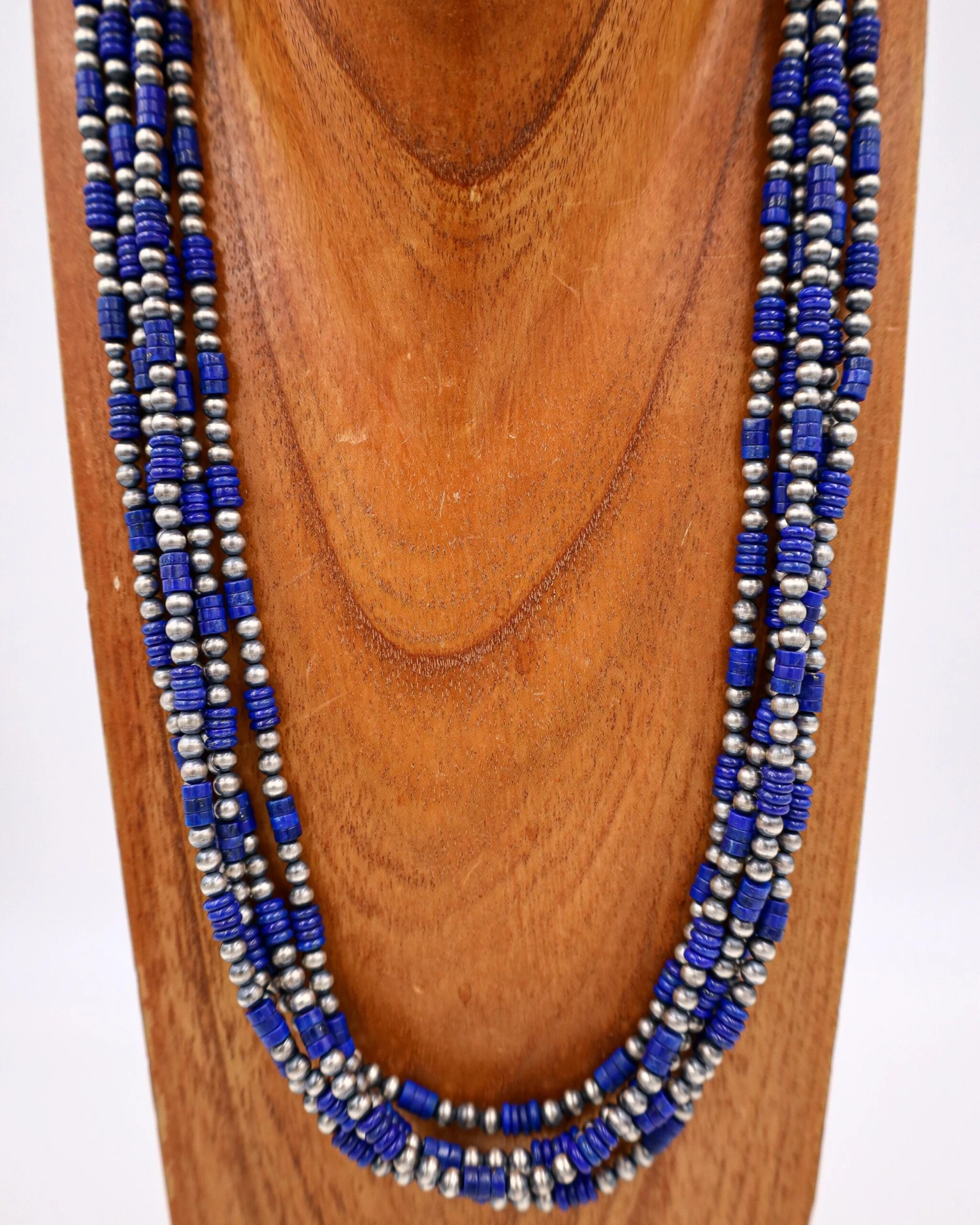 This stunning necklace exudes luxury! Crafted from five strands of sterling silver and an array of luxurious beads; each carefully selected for size, shape and color for an exquisite combination. Enjoy the glamour of lapis and Navajo pearls, perfect for any special occasion or everyday use. What sparkle will you add to your wardrobe?