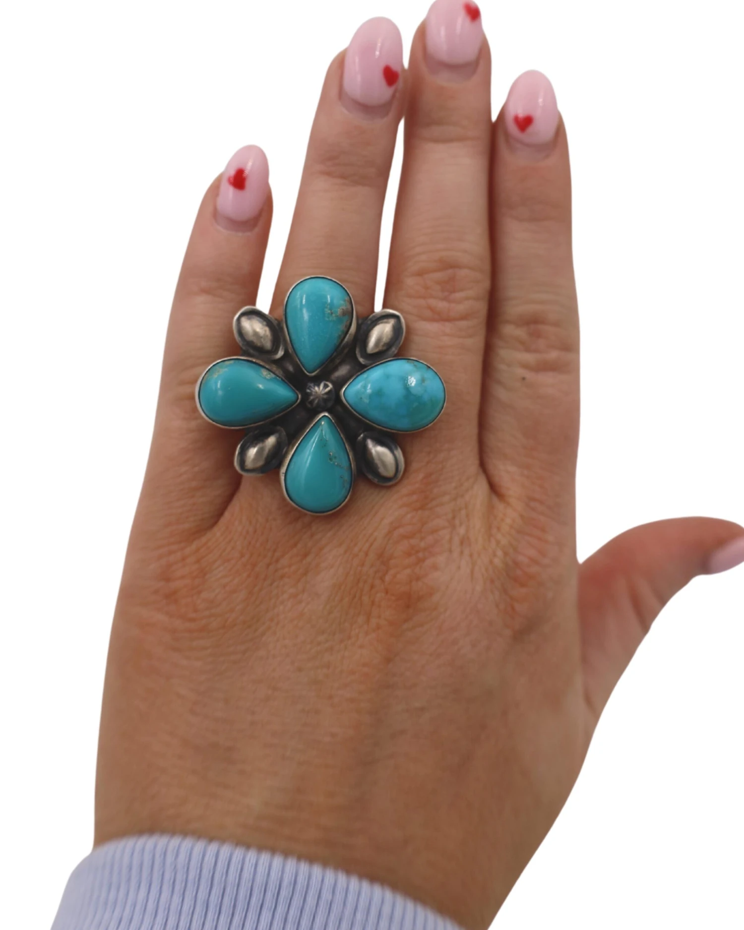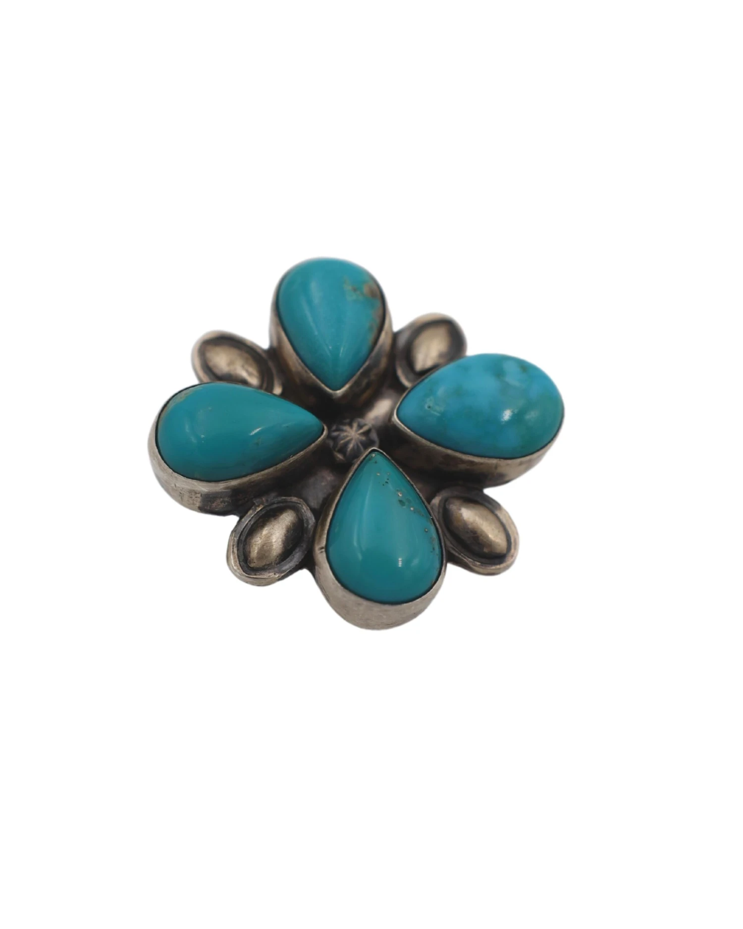 This statement ring is a thing of beauty! Crafted with genuine sterling silver and four vibrant turquoise teardrop stones in a stunning flower formation, it’s sure to add a touch of glamour to any formal occasion. Make a statement with this striking ring, size 5.5.