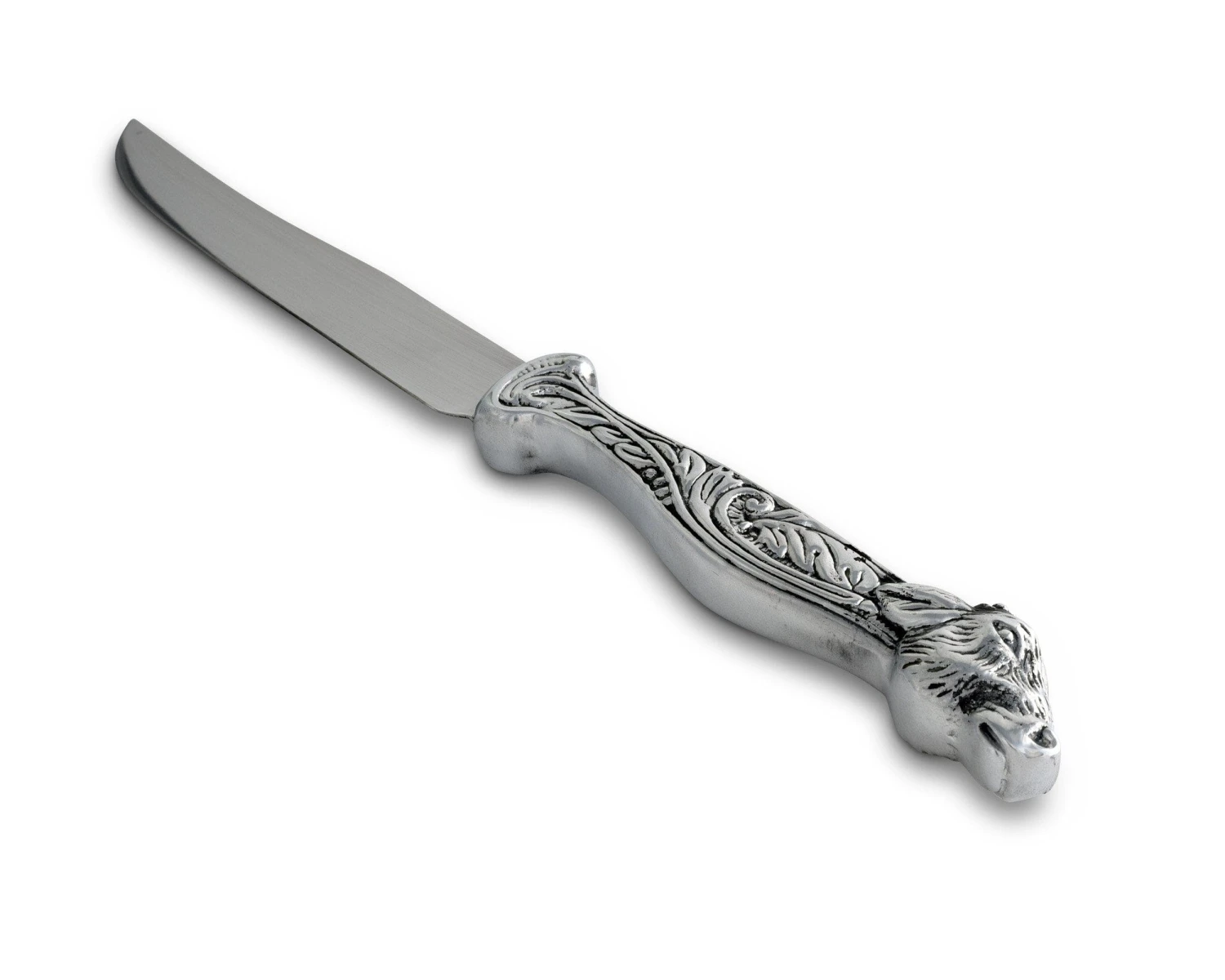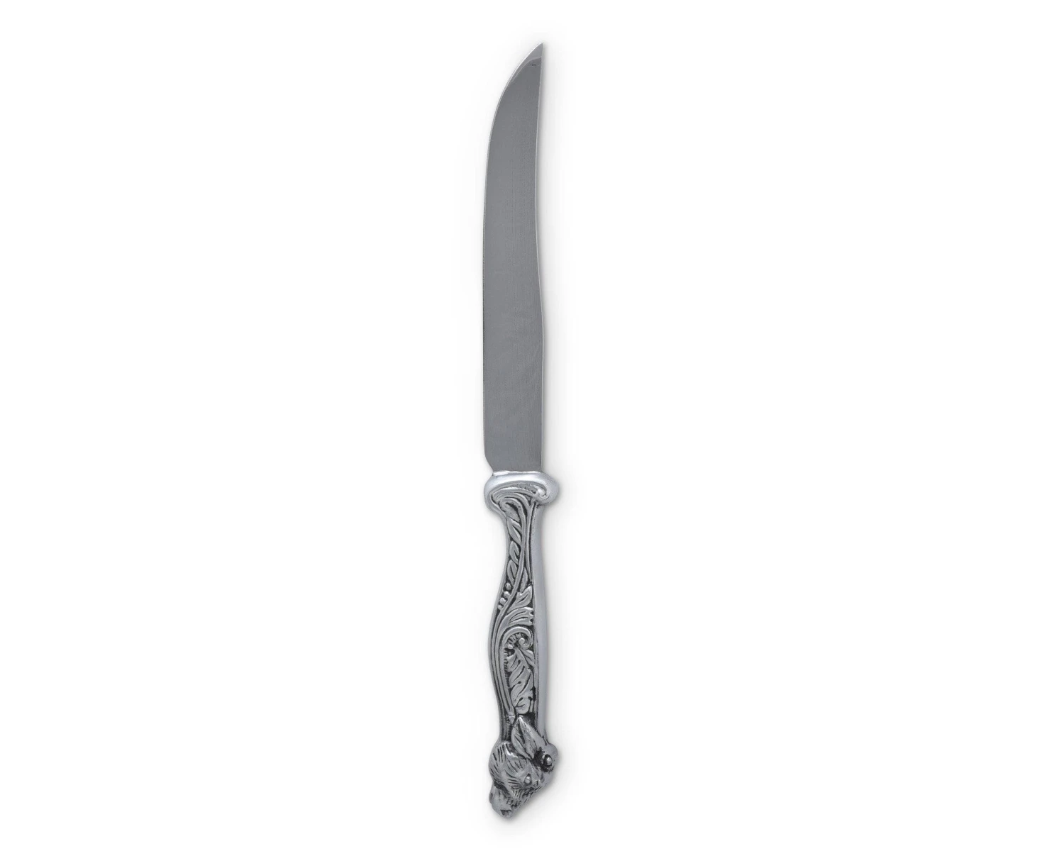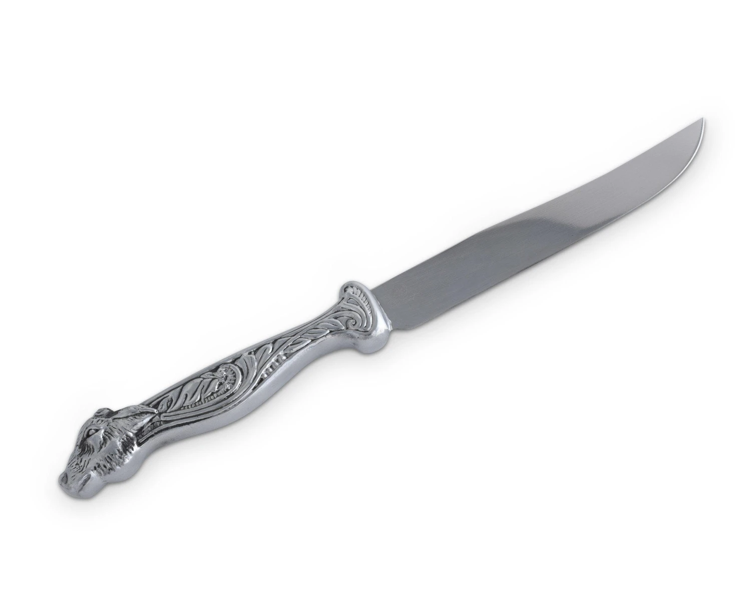 Luxurious western themed carving knife that offers functionality and style. The long, stainless steel blade resists rust, corrosion and discoloration and cuts easily even through larger meats. A stylish and functional designer piece that will stay in your household for years.