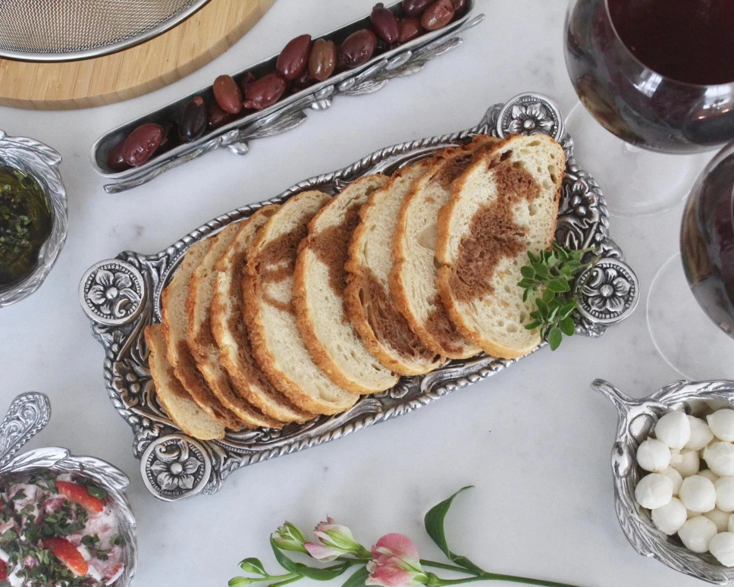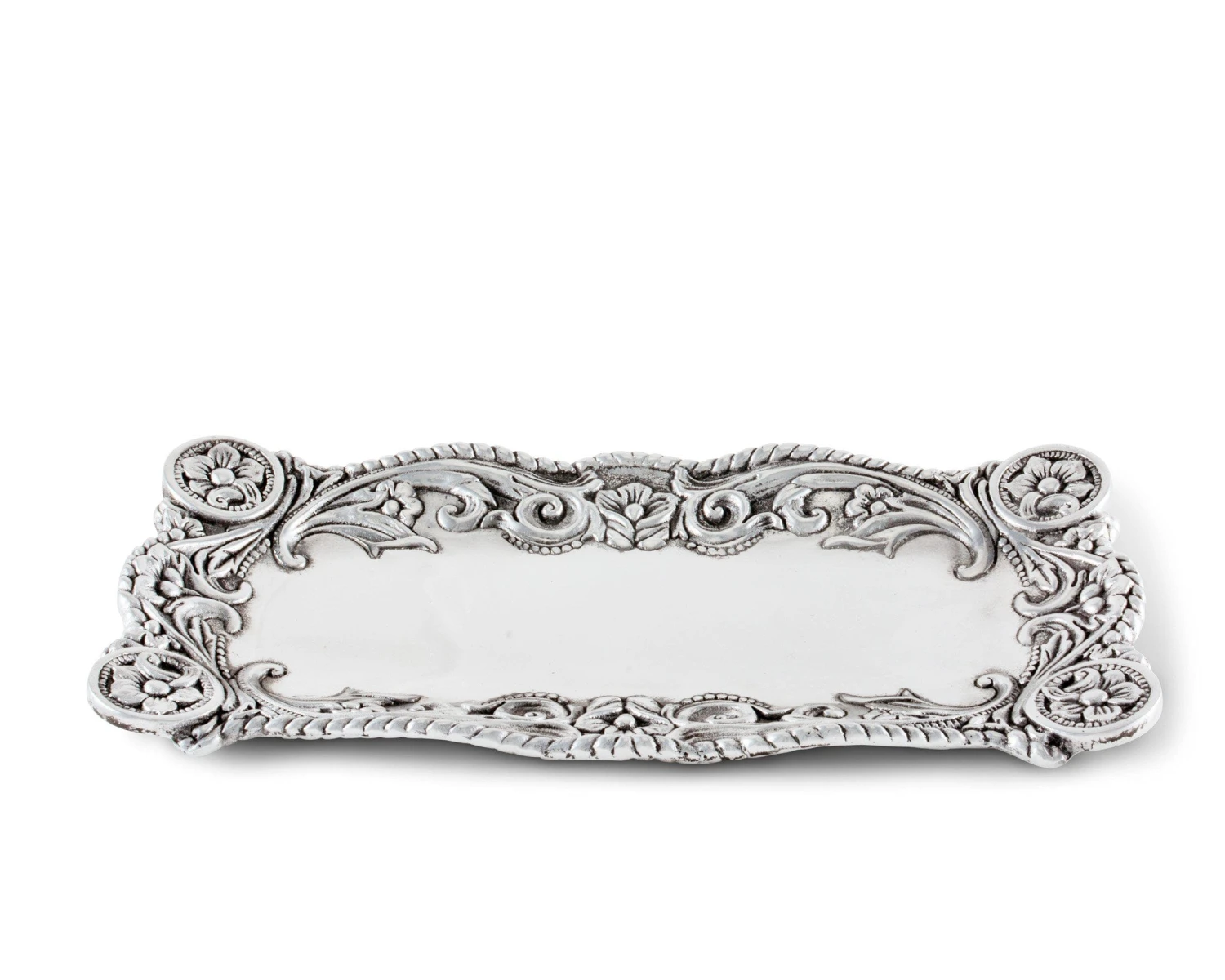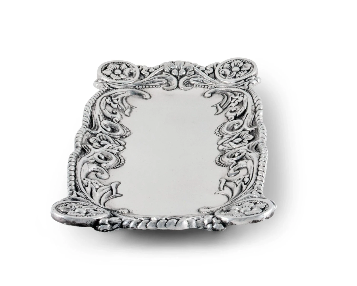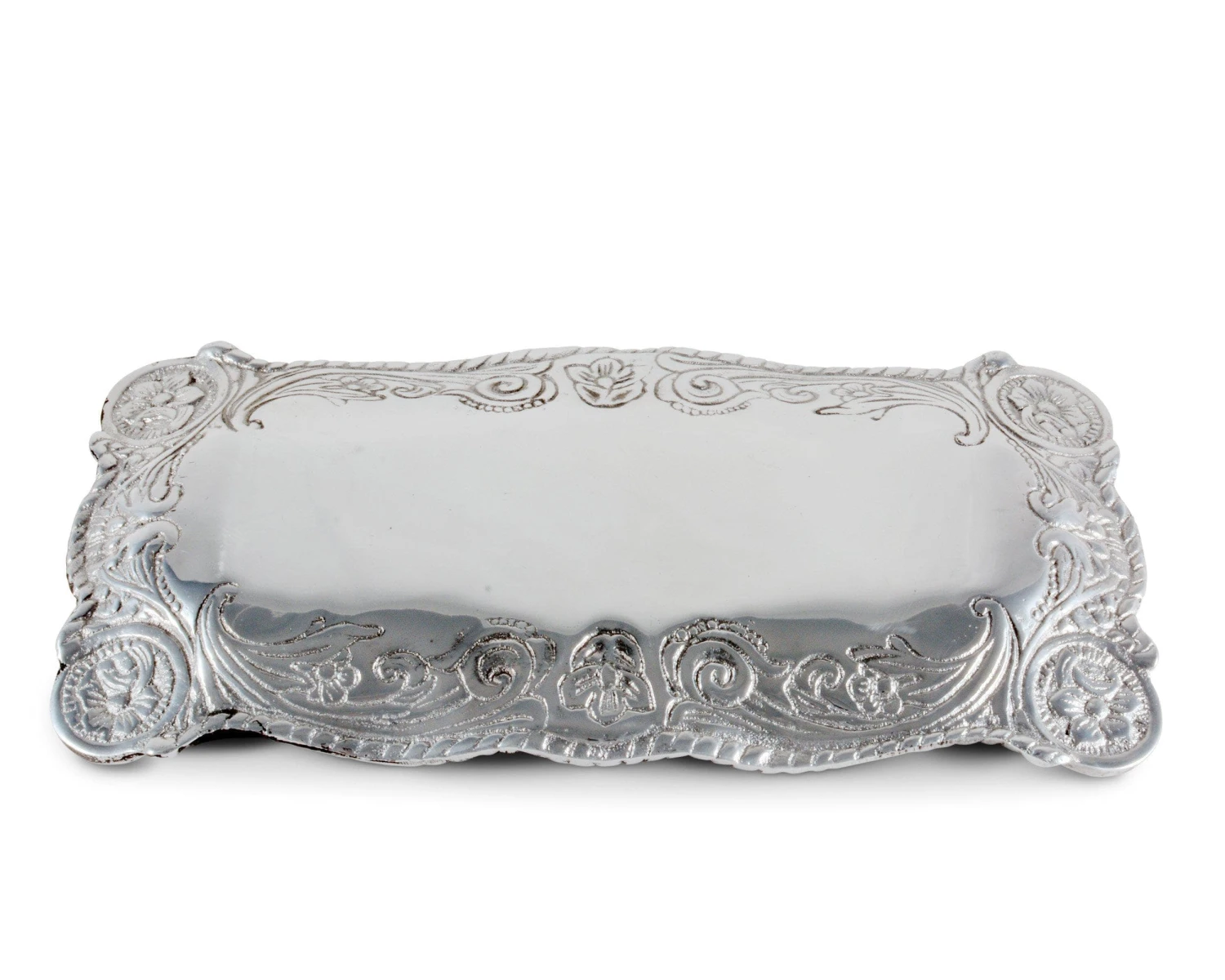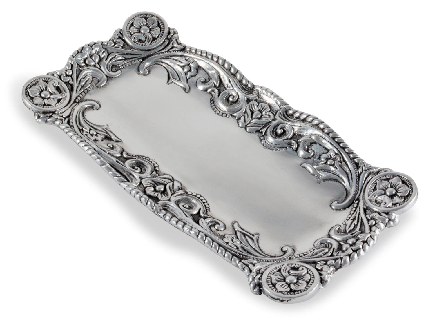 Rimmed with the romantic, ornate detail of the southwest, four cactus flower Conchos anchor the tooled leather type design that edges our Concho Bread Tray. Truly art in aluminum, the middle serving space is without detail to showcase the delicacies being served. At home on your table or dresser, this tray pleases the eye and heart.