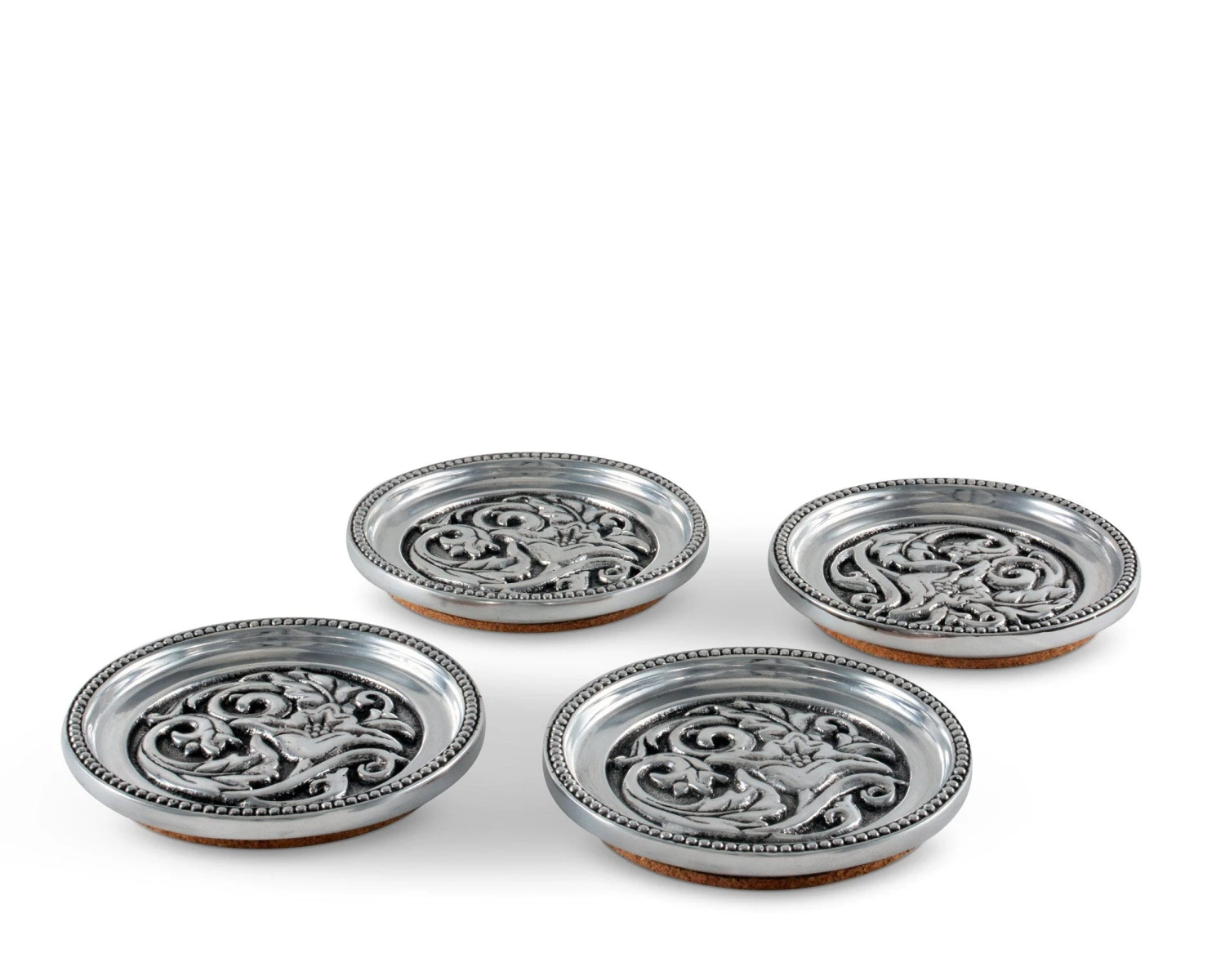 Beautiful Cactus Flower Concho Coasters are inspired by Native American jewelry and leather design, and crafted to serve ware for your home, bringing a touch of southwest romantic style to any room. Arthur Court’s set of 4 Concho Drink Coasters feature an ornate repousse design of the cactus flower. Beaded edging completes the look of these designer aluminum coasters.