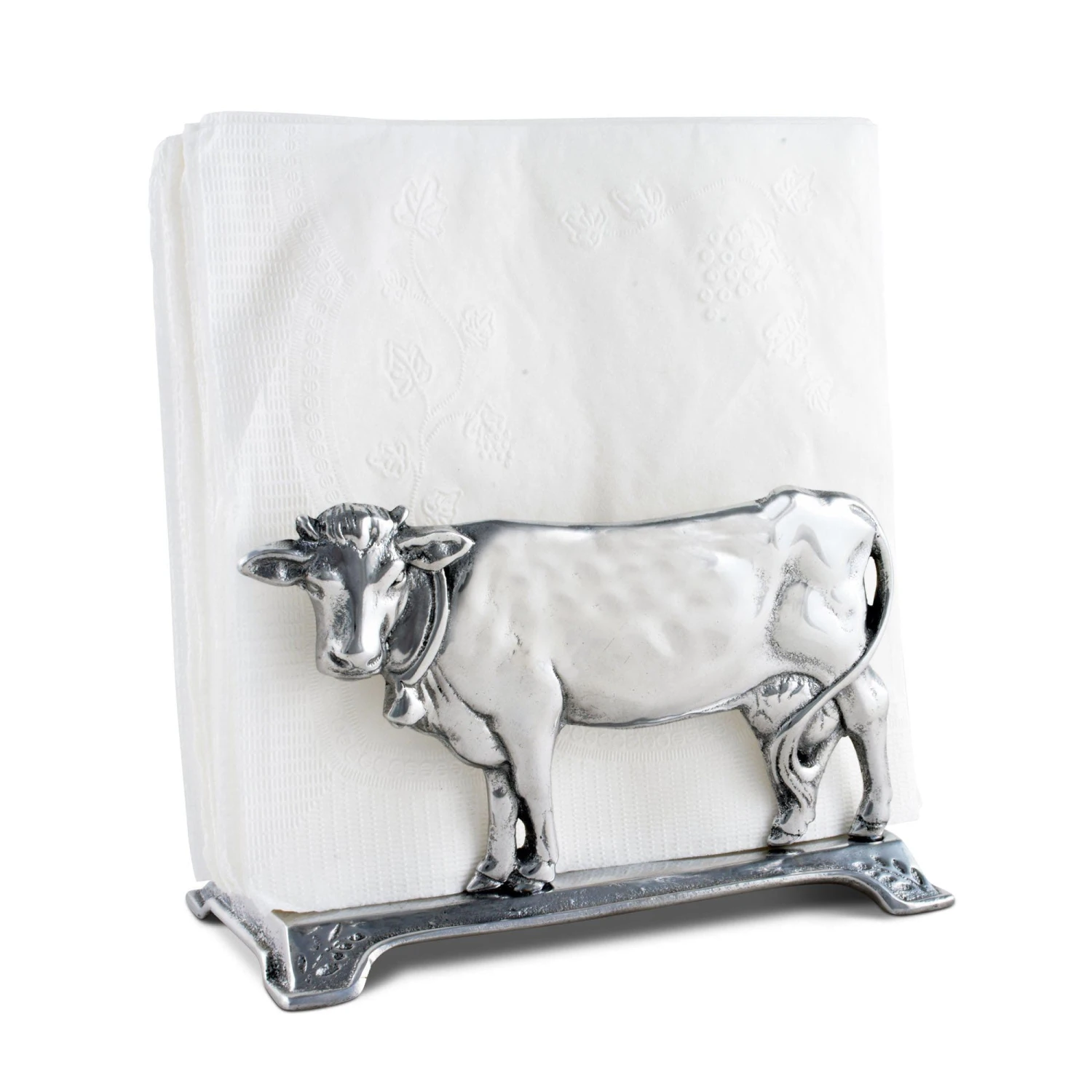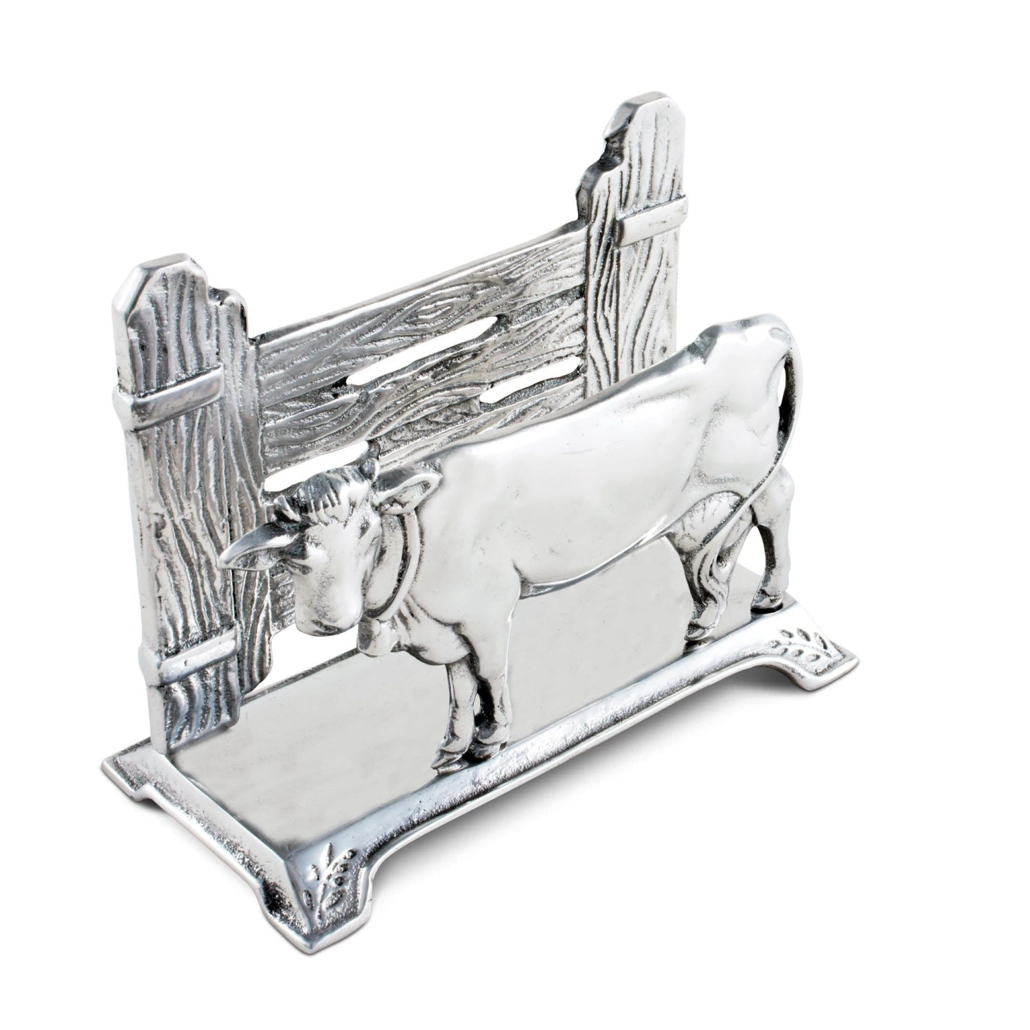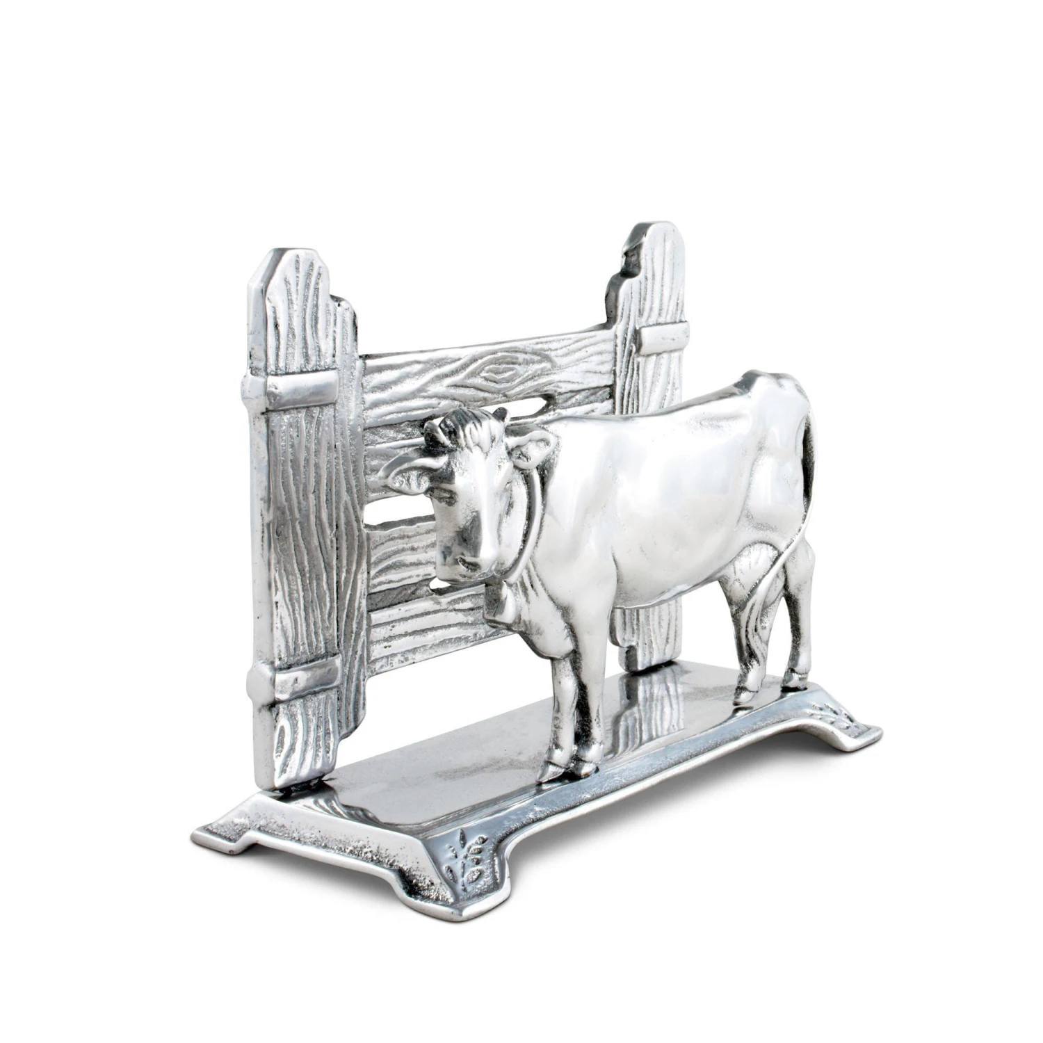 A hand-crafted pastoral scene in aluminum, our new Cow Napkin Holder is a delight on your table or counter. Detailed on both sides, the front depicts our lovely, content dairy cow, Annabelle, complete with collar and bell. The rear view is the rustic, detailed fencing the cow stands in front of.