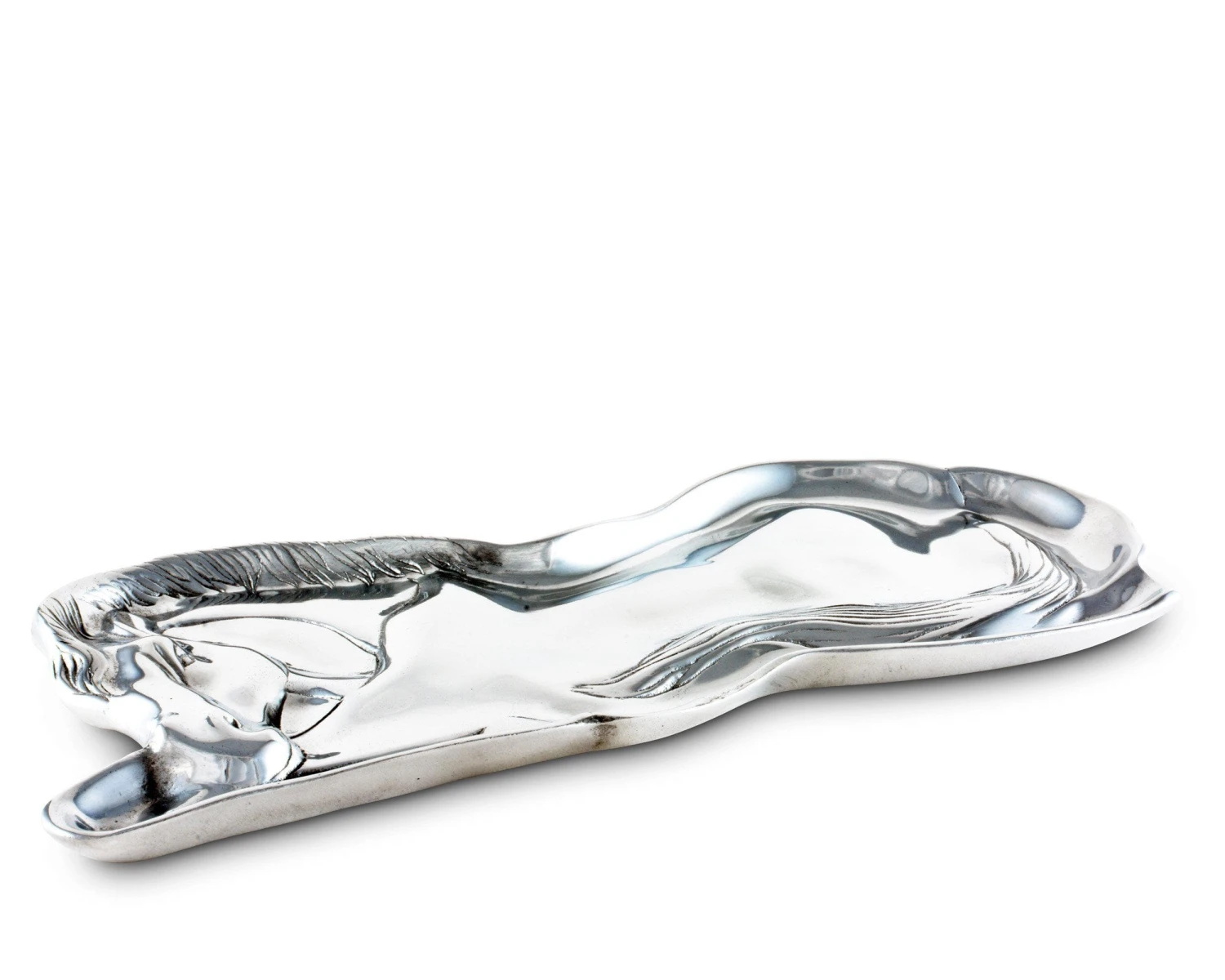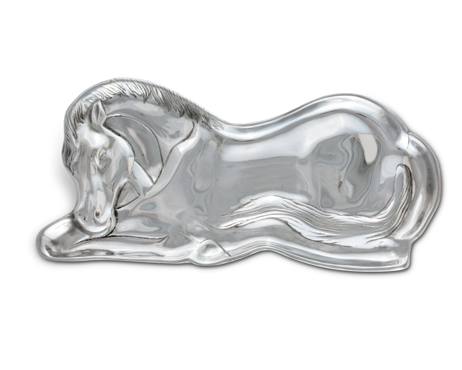 The shape of this design follows a stallion as it rests its head down for a nap. The textured lines offer a nice break in the otherwise clean edge of this handmade, aluminum tray.