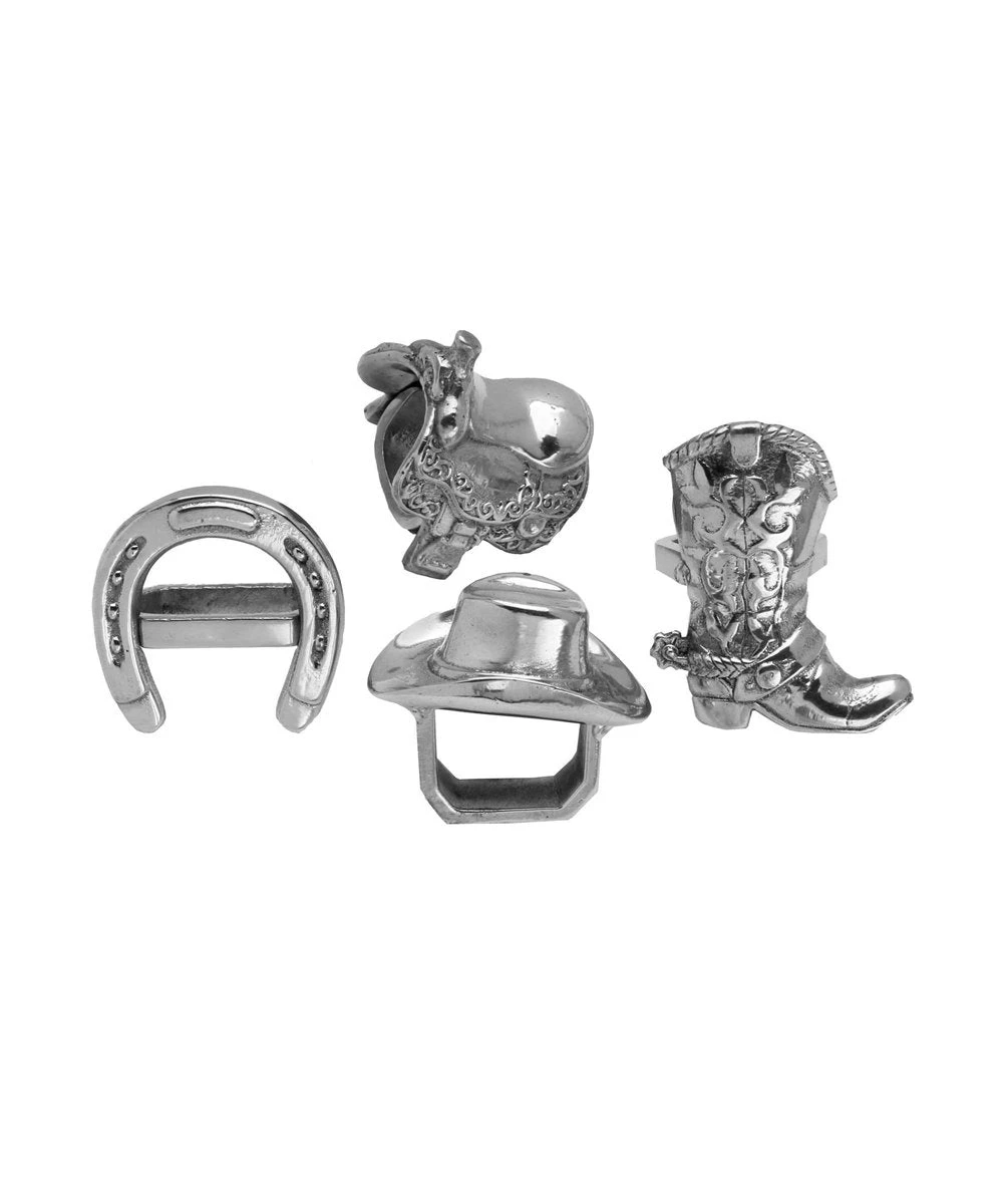 Accessorize your Western-themed party with this set of four unique napkin rings from Arthur Court. Enliven the party conversation as guests unfold their napkins and compare the different rings, which include a cowboy hat, boot, horseshoe and saddle. Each of the Western-style ring tops is handcrafted using premium signature aluminum alloy for a gleaming shine that won’t tarnish over time. The fine details included on each napkin ring, such as the realistic spur and straps on the cowboy boot and nailheads on the horseshoe, perfectly realize the spirit of the Old West. These Western napkin rings measure 3 inches x 2 inches for fitting a cloth napkin through the ring’s center. The set comes packaged in a gift box, making it a lovely housewarming gift for someone’s new ranch home.