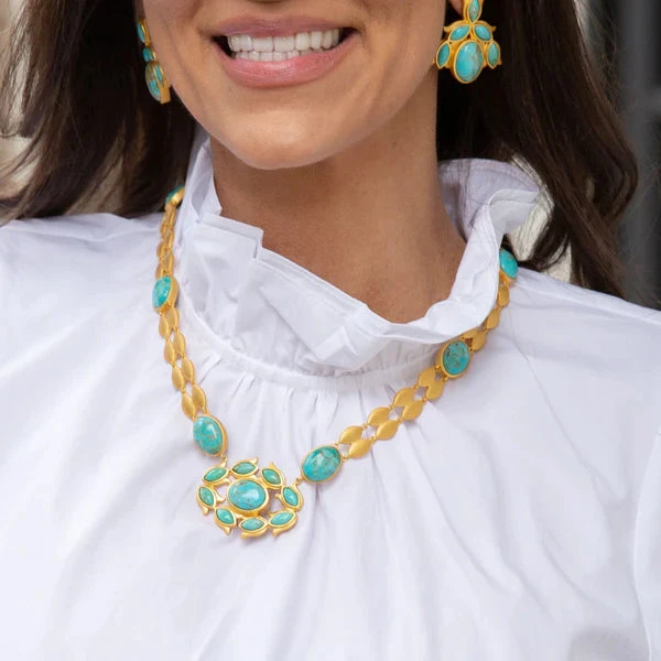 If you’re looking to make a statement, the Orchid Necklace in Turquoise is the look to reach for. Featuring a dual bulb chain that is punctuated by oval-shaped turquoise stones and attached to an intricate floral centerpiece, this necklace is a stunning piece. This necklace is crafted from 18K gold-plated brass and is nickel-free for comfortable, hypoallergenic wear. Pair this necklace with the Iris Ring and Flower Crown Cuff for a complete look. This necklace is also available in green strawberry quartz.
