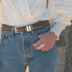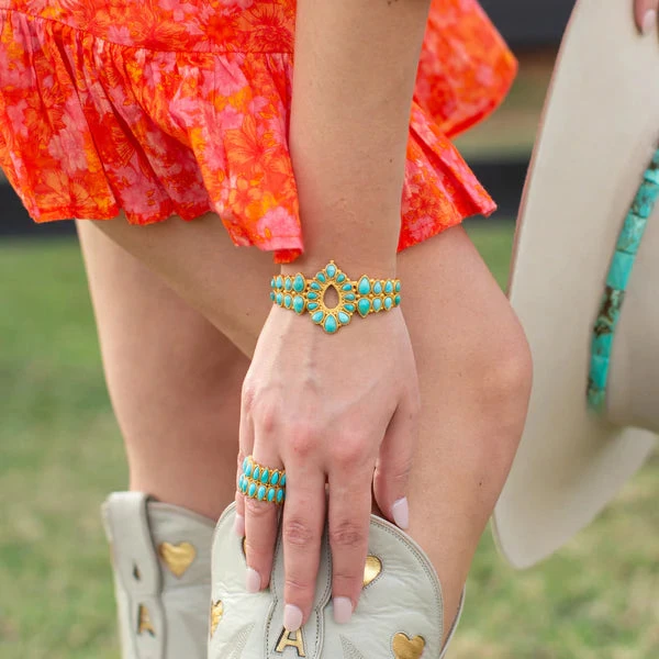 Everyone needs a statement-making style in their jewelry collection– and the Zion Cuff is it. This bracelet features a variety of teardrop-shaped turquoise stones set into 18K gold-plated brass. The mosaic centerpiece features a teardrop-shaped cutout and is flanked by reflecting turquoise stones in descending sizes. An open back provides a one-size-fits-all design that allows the wearer to choose their perfect fit. Pair this hypoallergenic cuff with the matching Zion Ring or the Desert Rain Drop Earrings for a complete look.
