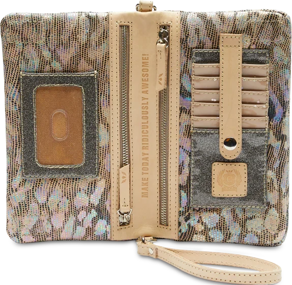 The Iris Uptown Crossbody is the perfect combination of luxury and practicality. It’s crafted with textured leather and iridescent jag print exterior, double magnetic closure, and two interior zipper compartments. The exterior zipper compartment provides easy access to 6 card slots and an ID window. It includes a wristlet strap and adjustable crossbody strap with a 16 ½”-29” drop, allowing you to adjust the bag to your lifestyle. 8 ½” (L) x 5” (H) x 1 ½” (D).