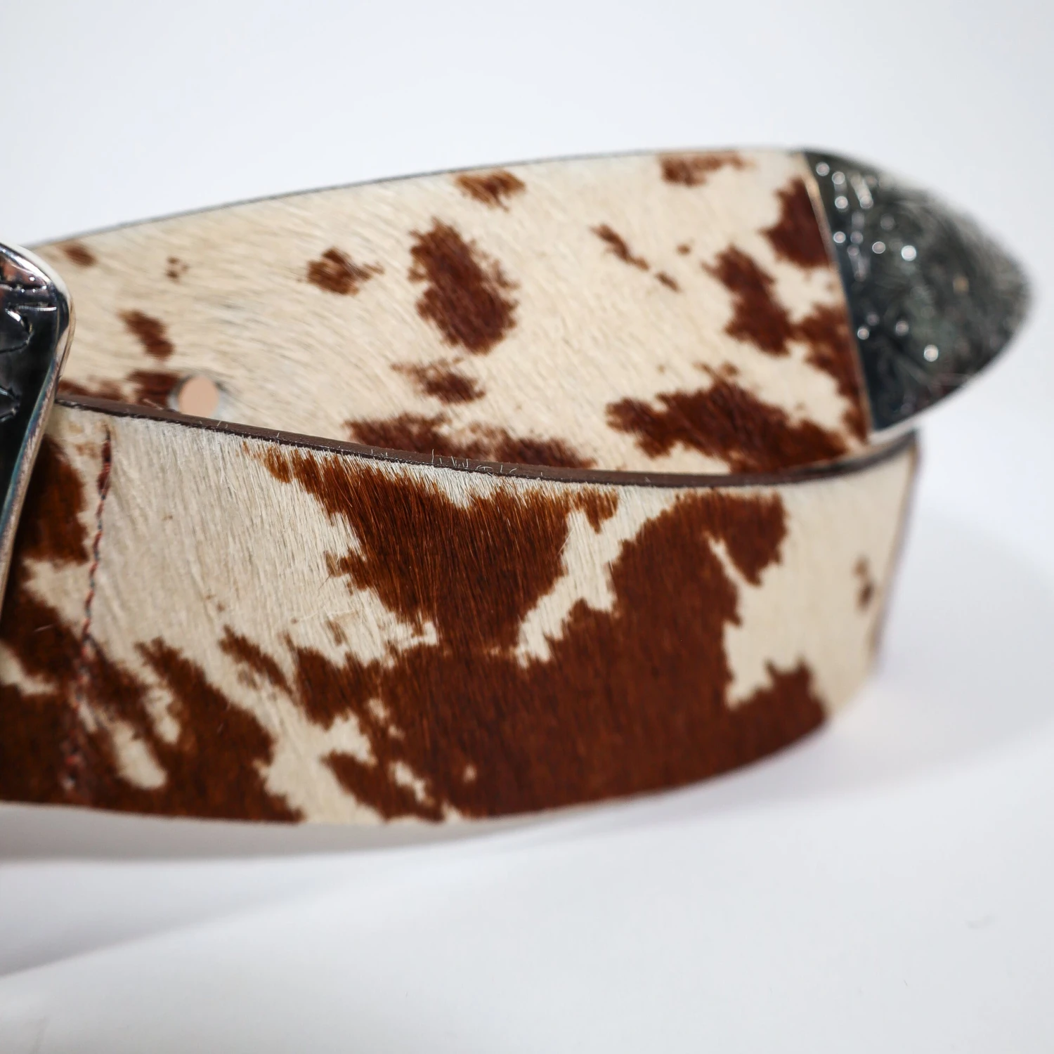 Brown and white hair on cowhide belt with oversized antique silver western buckle set.