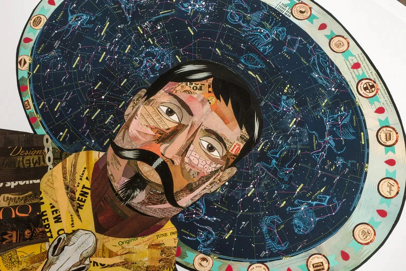 Archival preproduction of original Charro paper collage artwork featuring cowboy with constellation sombreor. Modern Western figurative portrait using vintage materials. Combine with sugar skull cowgirl for his and hers set.