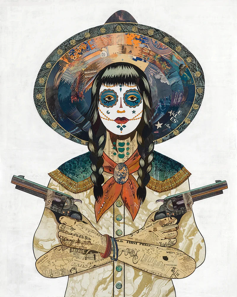 Archival reproduction of original Fool’s Gold paper collage artwork. Day of the Dead cowgirl in turquoise, orange and gold jewel-toned western attire, including a marbled gold shirt a hat depicting a night sky’s moon and stars, and a vibrant floral brooch clasping a blood orange hued bandana.Â