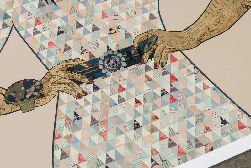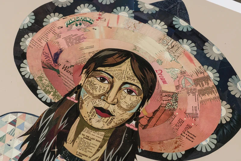 Archival reproduction of original paper collage of woman wearing quilt pattern dress with bold floral hat and elaborate jewelry. Triangle design in dress resembles fabric scraps. Contemporary western figurative artwork.