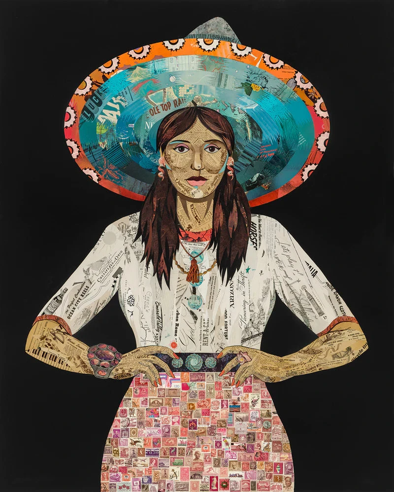Archival reproduction of original paper collage artwork of brunette woman wearing a fun vintage stamp skirt with bold floral hat and elaborate jewelry. Contemporary western figure art.