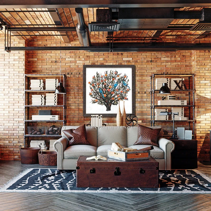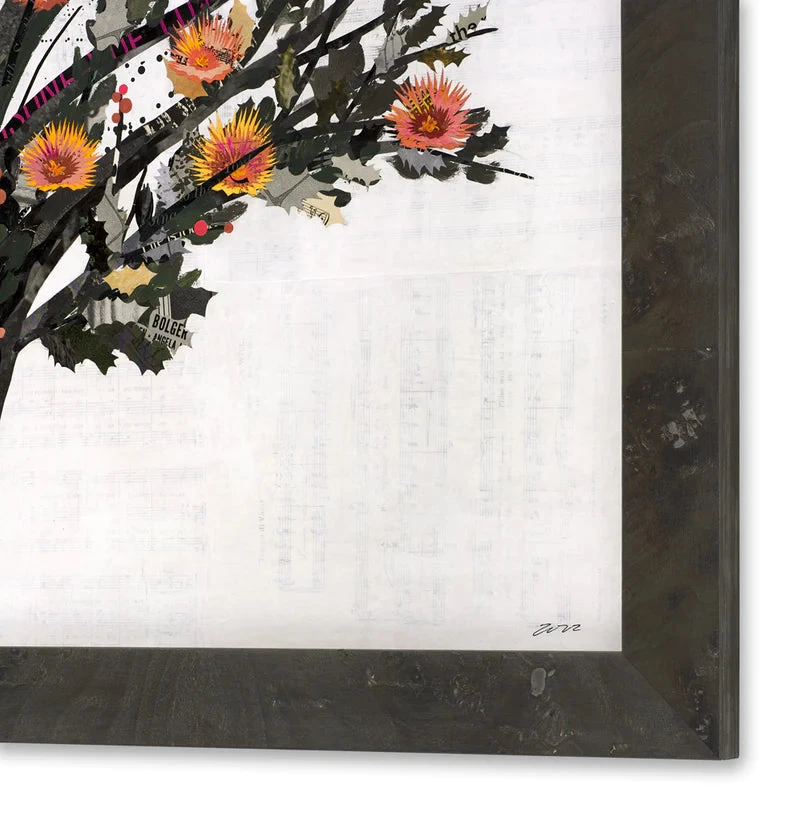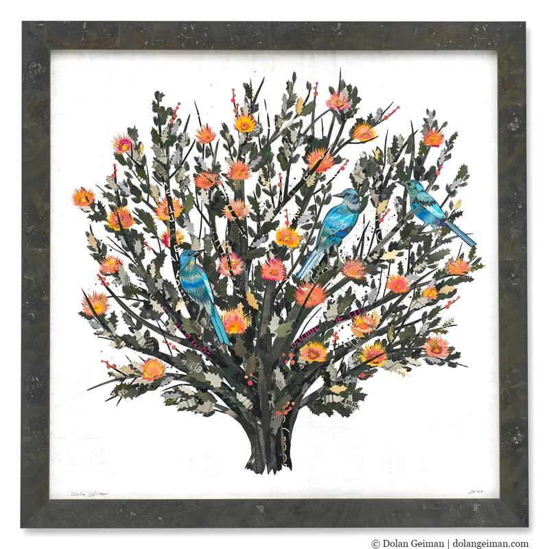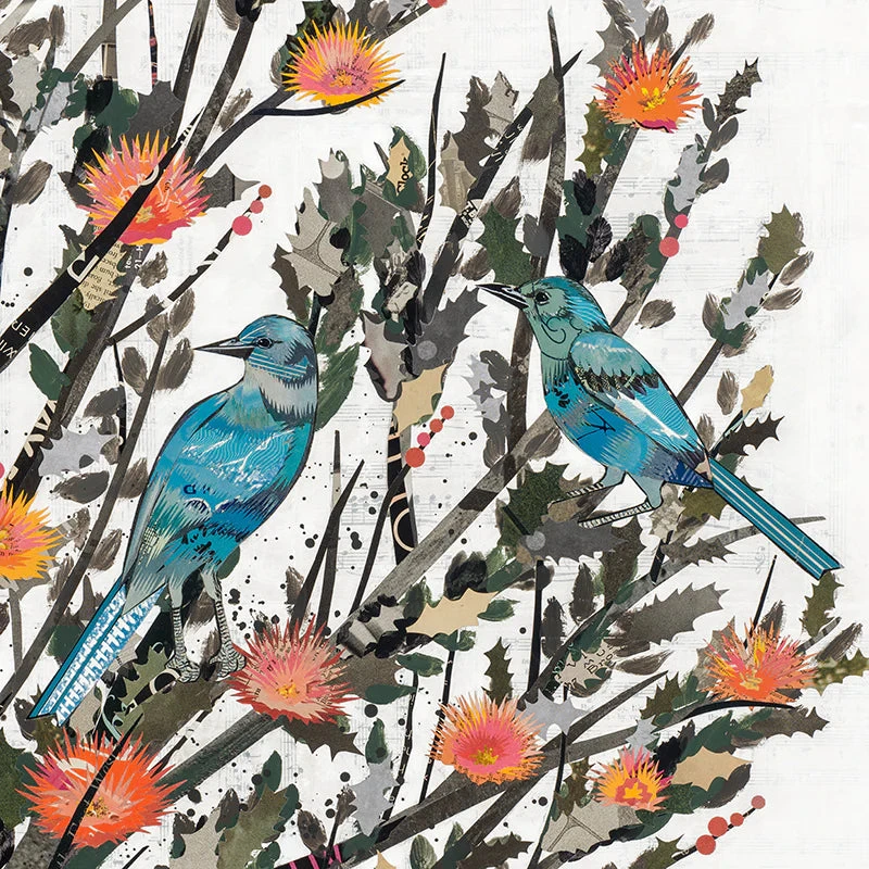Archival reproduction of original Pinyon Jays paper collage artwork featuring pinyon jays in shrubbery with floral accents. This piece was inspired by winter hikes in the Moab region of Utah.