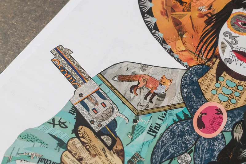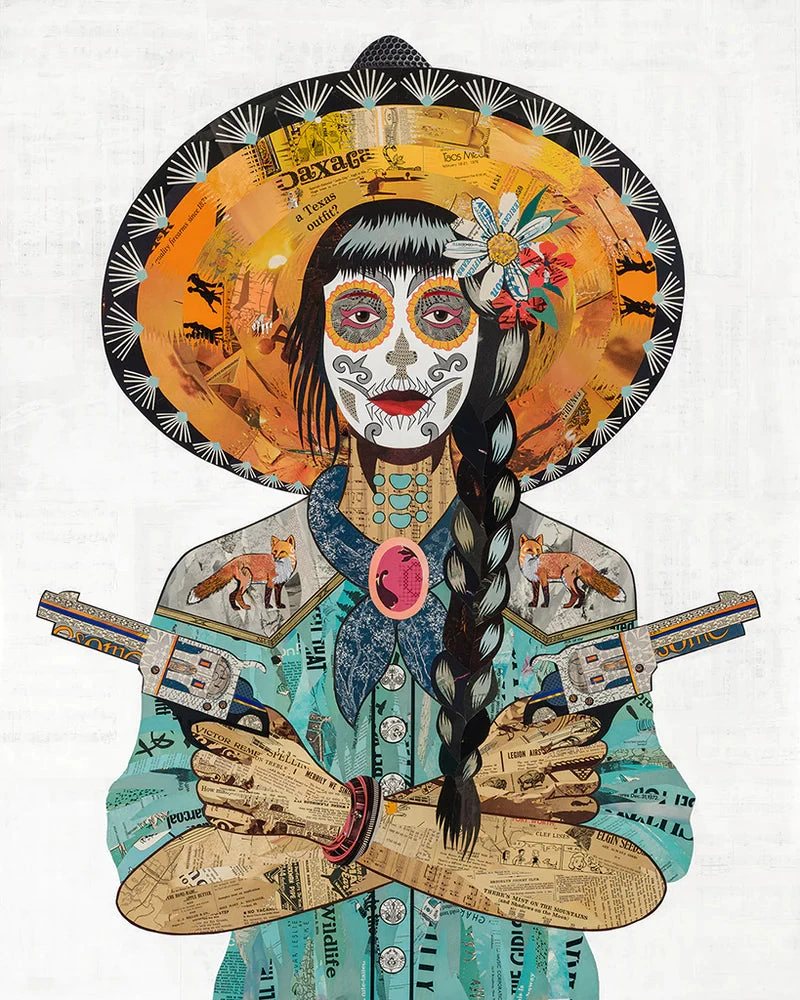 Archival preproduction of original Swift as a Fox paper collage artwork featuring a cowgirl with sugar skill makeup wearing a turquoise western shirt with fox shoulder detail, a vibrant red-orange hat and indigo bandana. Day of the Dead/Dia de los Muertos style contemporary southwest art.