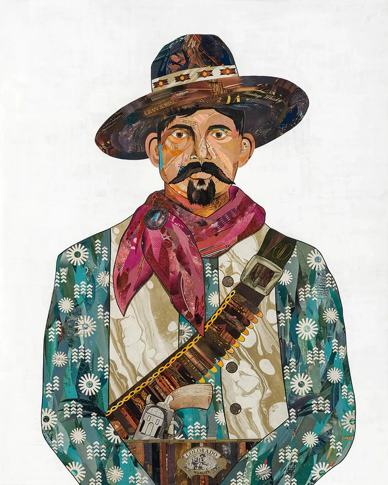 Archival reproduction of original The Prospector paper collage featuring a cowboy sporting a rich burgundy bandana and unique southwest sun-print western shirt, topped with a metallic gold vest. Celebrating bygone eras of the Southwest’s history and story makers.