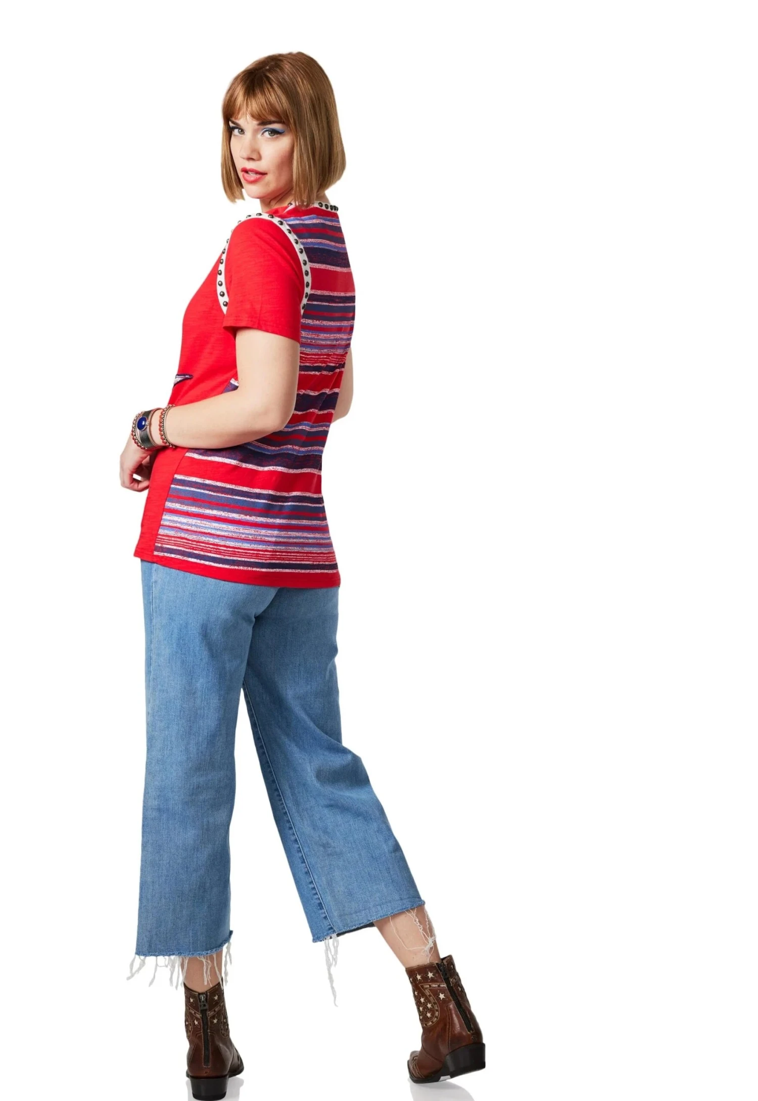 This colorful cotton top gives you 360 degrees of eye-catching awesomeness. The bold “rocket red” is complemented by a contrasting collar and sleeve trim accented with metallic studs; the front features a peek-a-boo longhorn embellished with embroidery while the back boasts a pretty print of red-white-and-blue hued stripes.