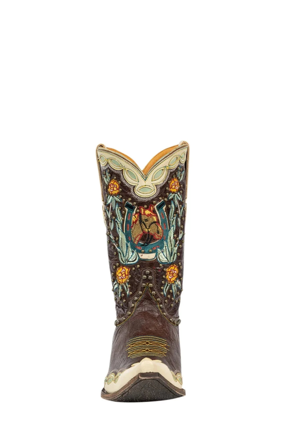 These colorful kicks were designed to complement the 2022 Wild Horses collection with Old Gringo, carrying on the western/horse motif with gorgeous hand-embroidered florals, horses, and horseshoes — right side up to catch the luck, of course! — accented by metallic studding and trimmed with contrasting overlay and underlay details.Â