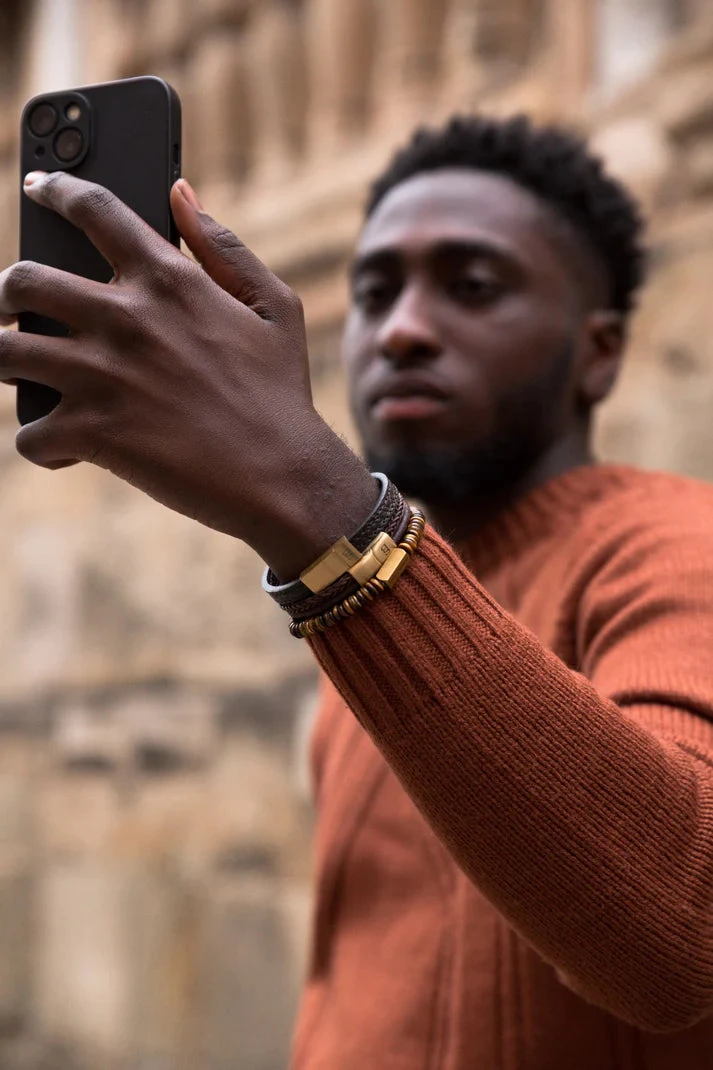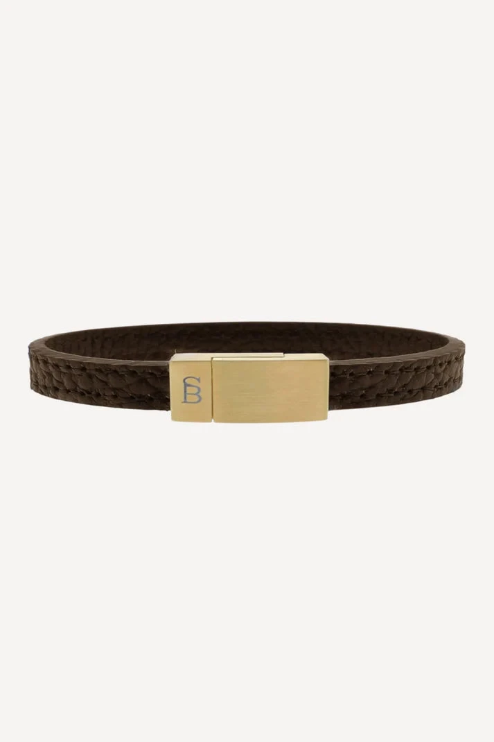 Featuring a thin band of pebbled cowhide leather tailored and trimmed up with stitching, the Grady is a handcrafted bracelet that is comfortable, minimal, simple and stylishly sophisticated. Finished with a brushed gold metal buckle clasp forged from solid stainless steel, the bracelet asserts itself as a token of elegance.