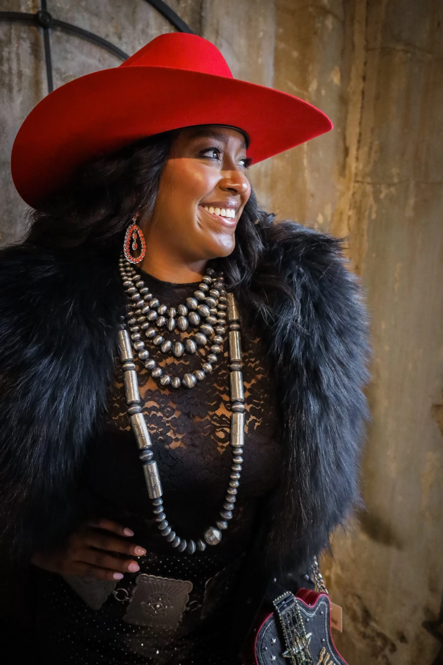 An incredible hat from the outstanding hat maker, Trent Johnson with Greeley Hat Works. The Calamity Hat is comprised of the finest European hare blend making a beautiful bright red felt that is adorned with a thin black cord hat band. This unique piece is sure to add a pop of color to any outfit!