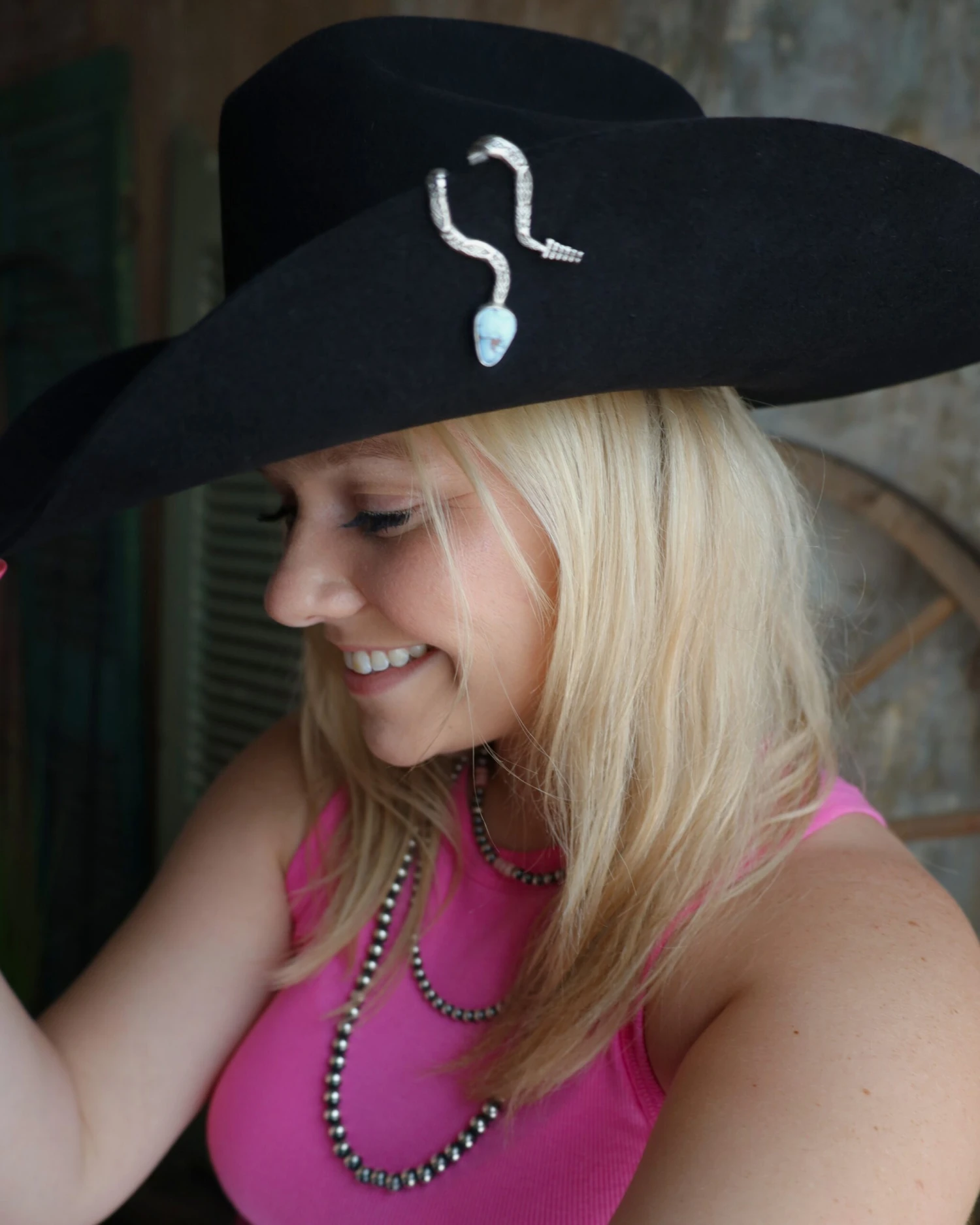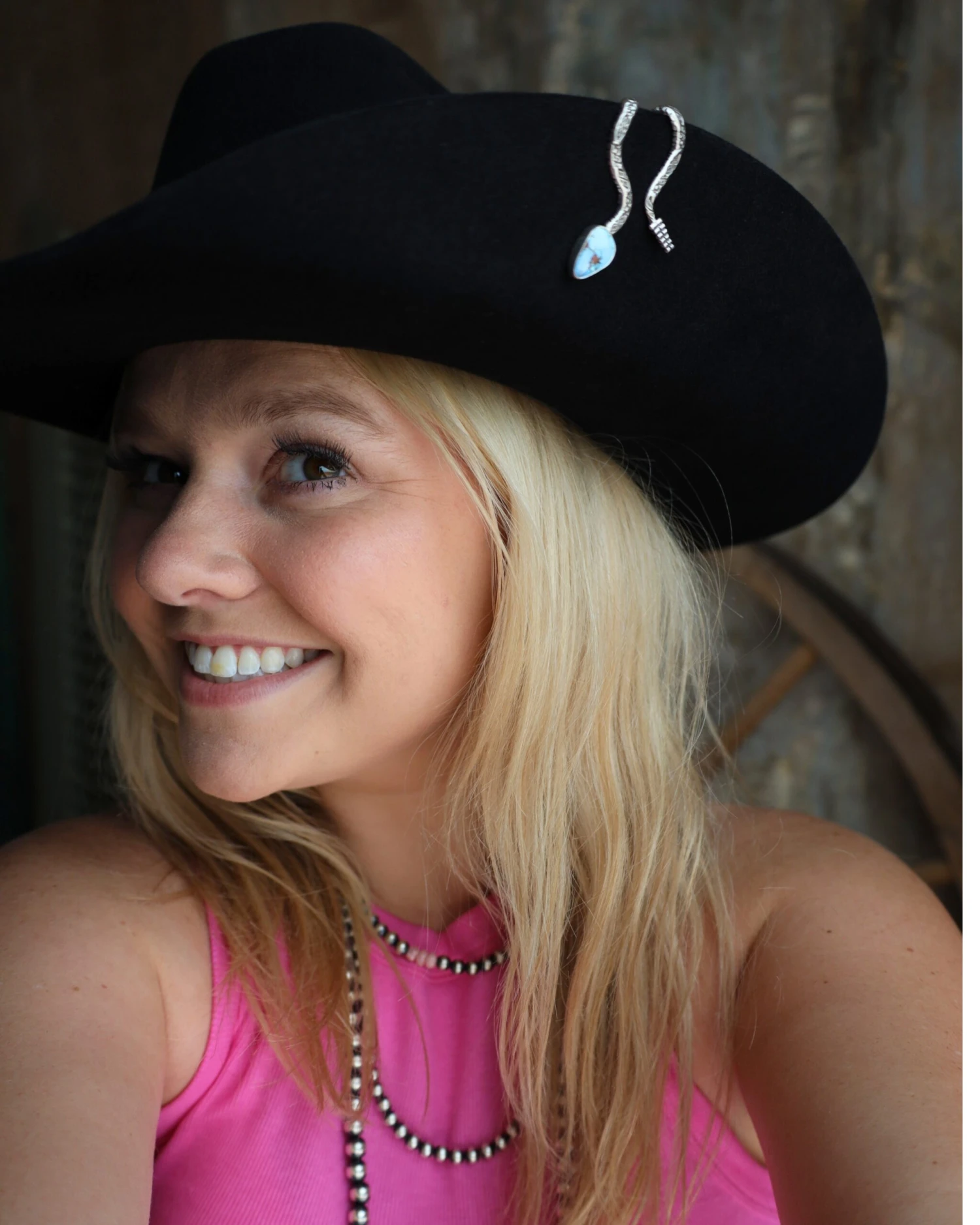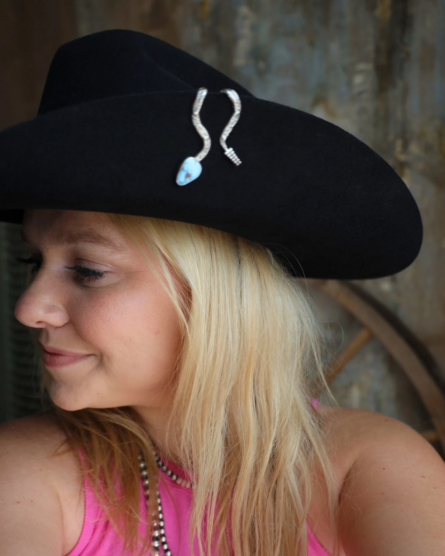 The Brim Biter is a contemporary, handmade, sterling silver & turquoise jewelry clip for your hat brim, lapel, boot shaft, you name it!