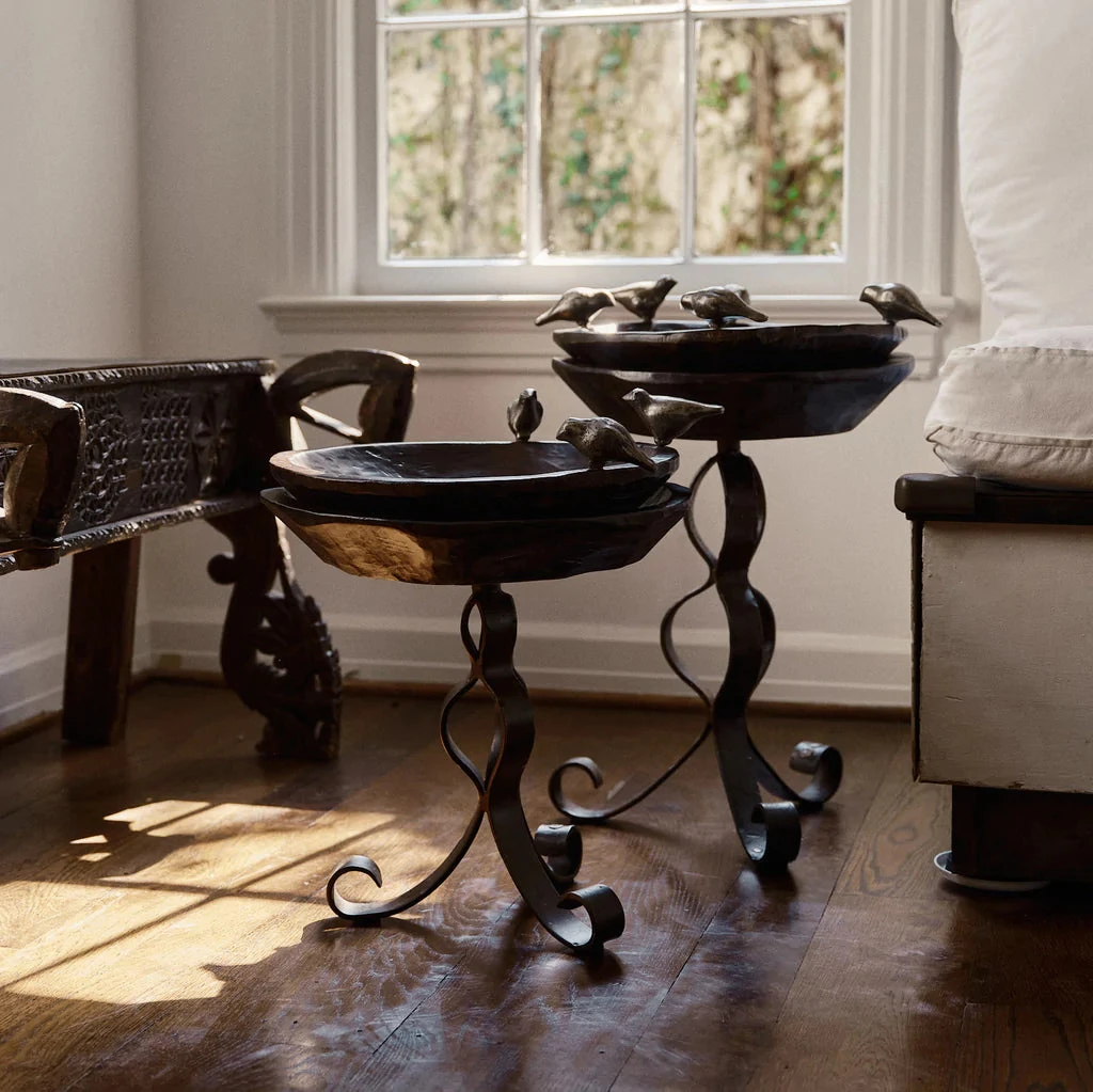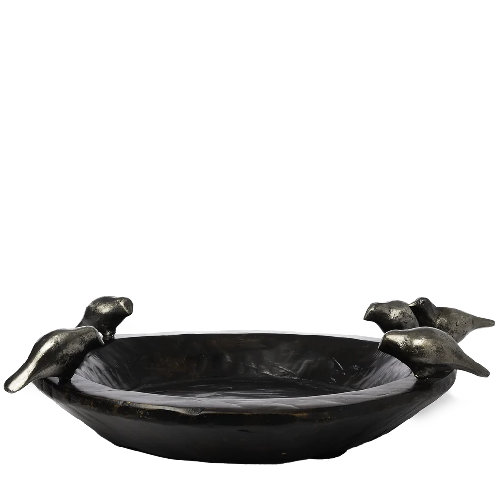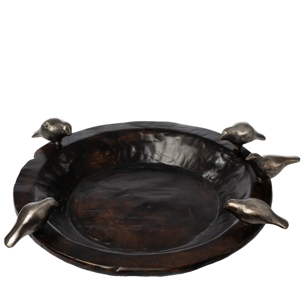 Hand carved 16″ primitive wood bowl with five cast iron birds . . . the more the merrier