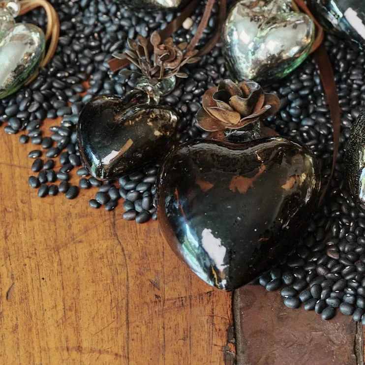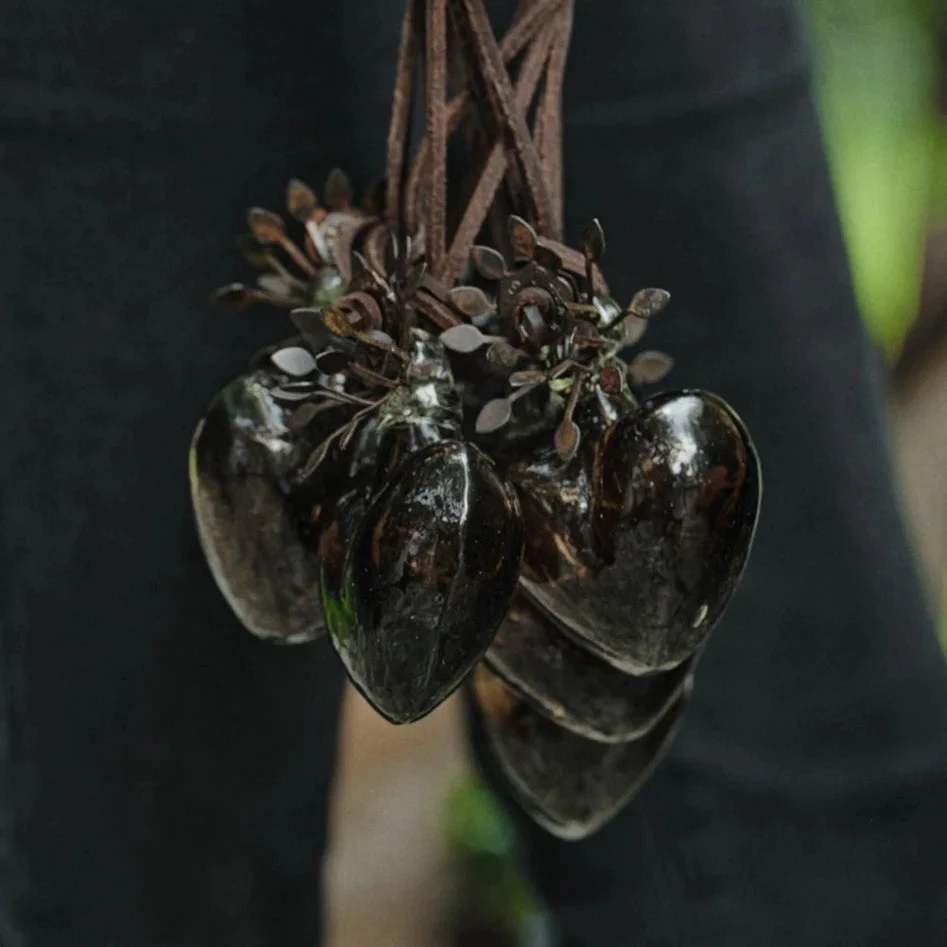 Mouth blown glass bathed in chocolate, rich in color . . . on a leather cord to hang from a tree, a door knob, or in the bridal suite . . . to catch a “blessing of light”