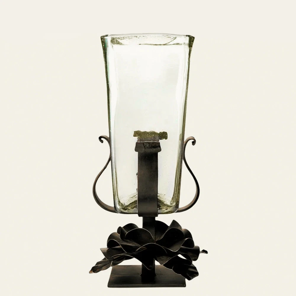 Mouth blown glass vessel on iron stand with forged iron rose.Â