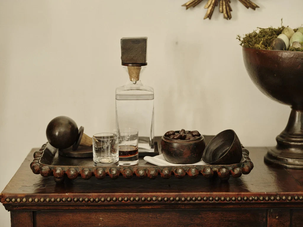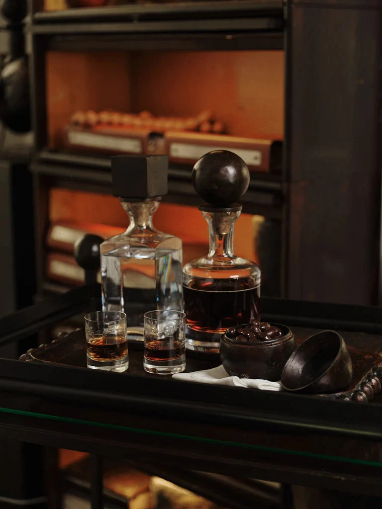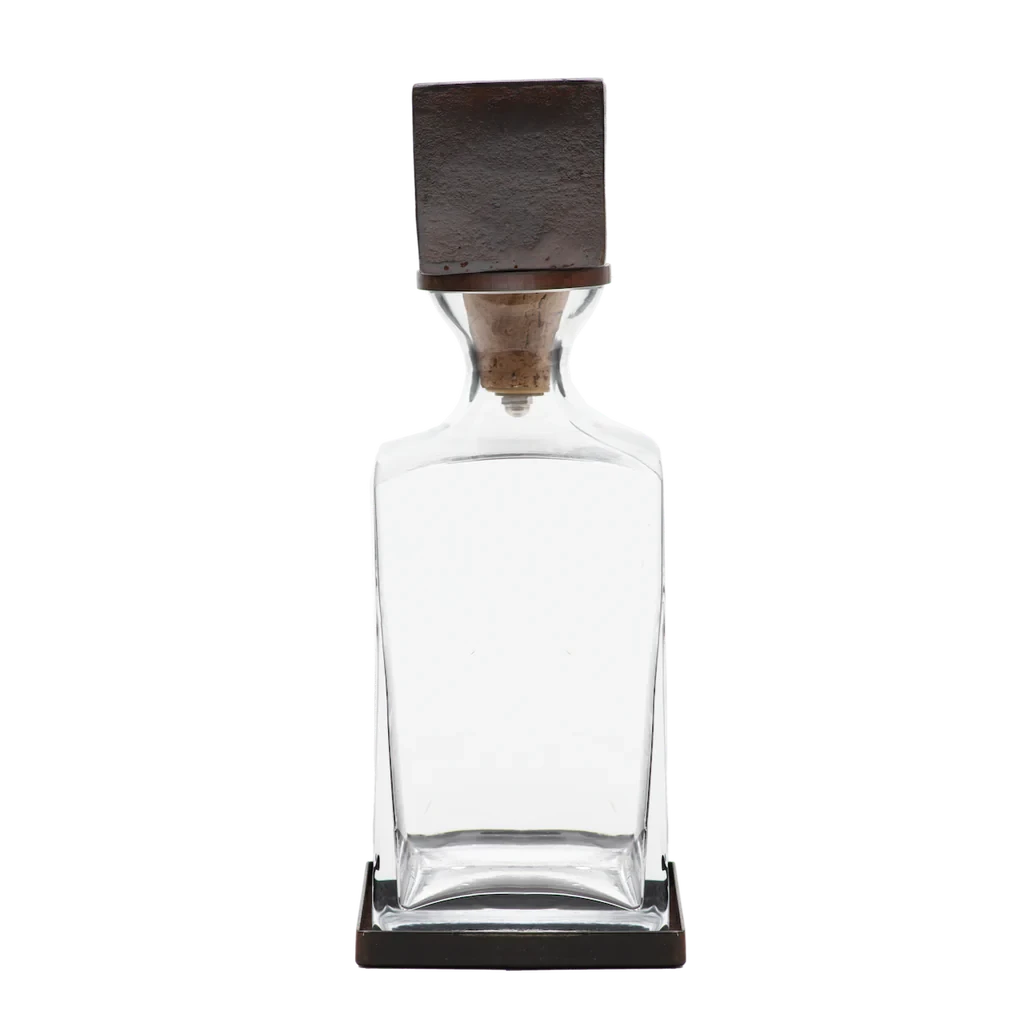Fine crystal decanter topped with an oversized wax cast iron cube resting in iron base …mechanical, foundational . . .Â