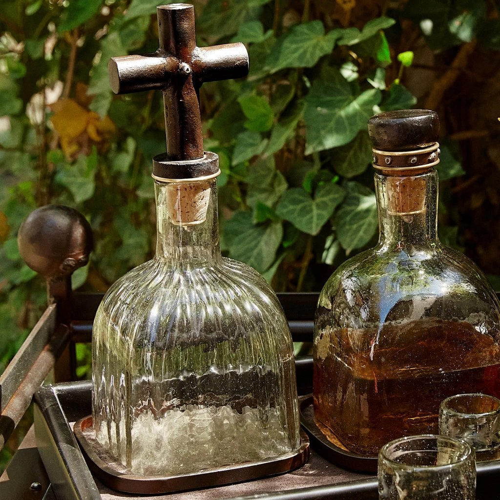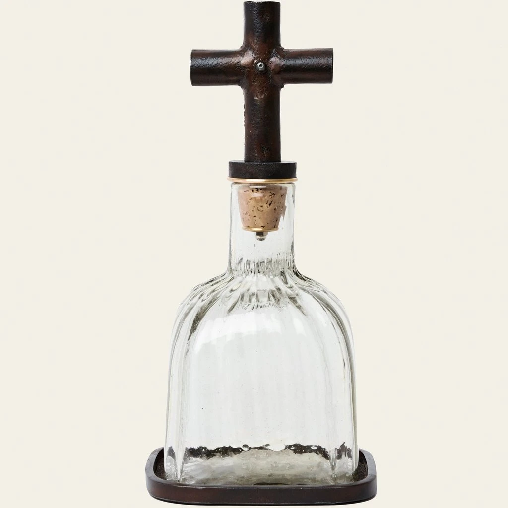 Sturdy and large mouth blown glass decanter with wax cast cross topper, resting in a tray lined with leather . . . holy water, or turn water into wine . . .