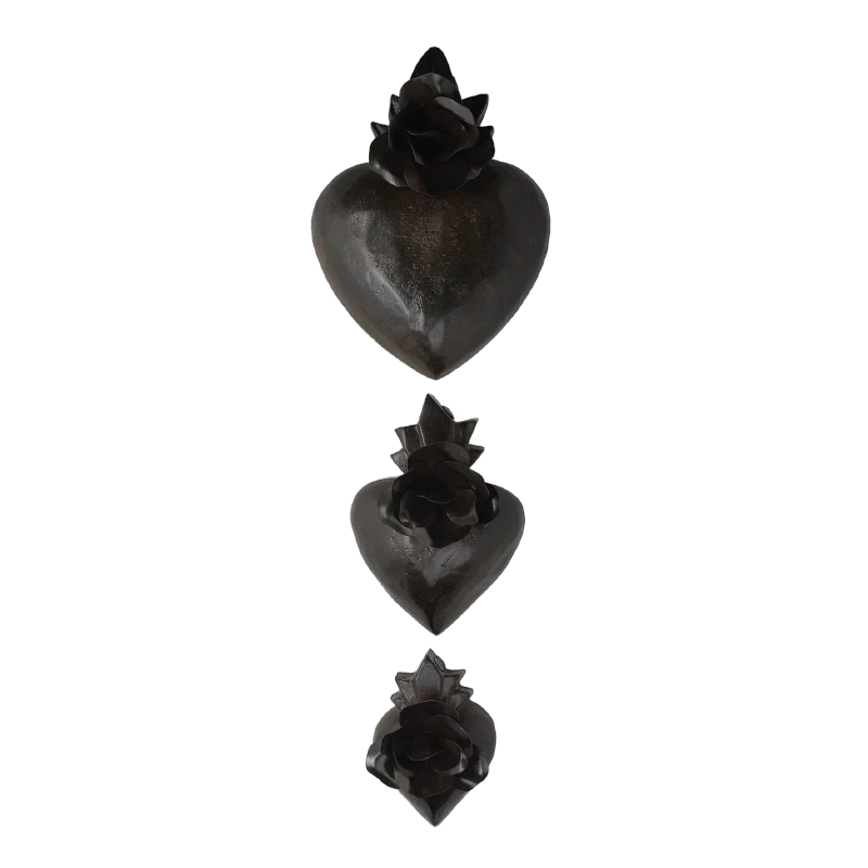 Set of three wax cast hearts topped with roses, small, medium, and large . . . hang on the wall or leave on a coffee table . . . for children, for siblings, for faith, for love, forever . . .Â