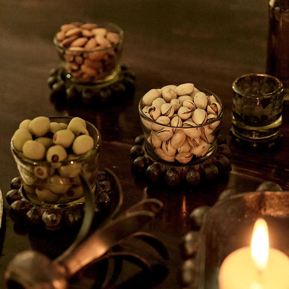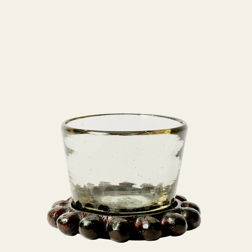 Mouth blown glass votive sitting in a wax cast ballin coaster . . . candlelight, after dinner drink . . .Â