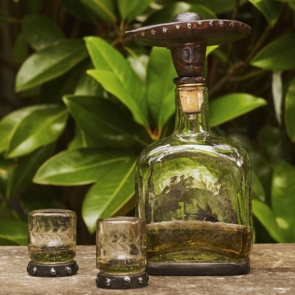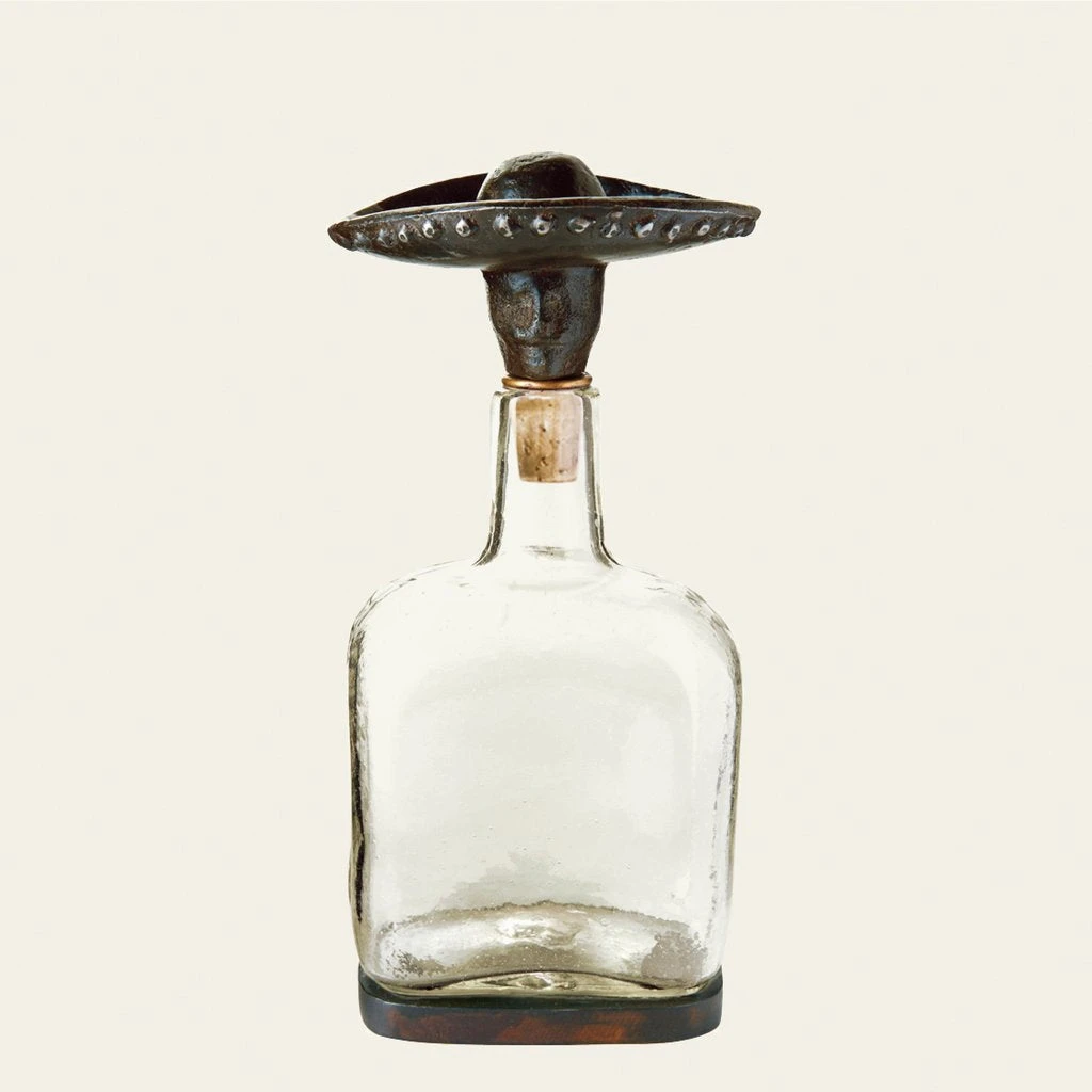 Mouth blown glass bottle with laurel engraved sides and small mariachi topper.