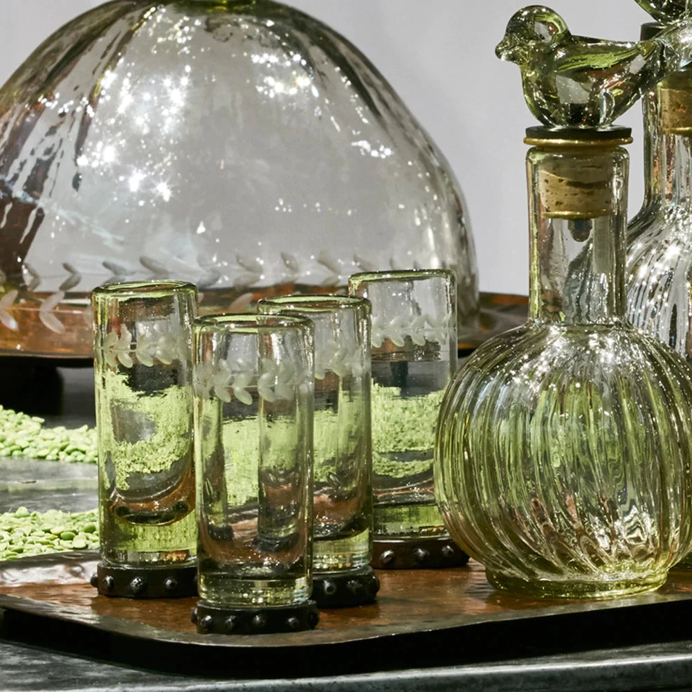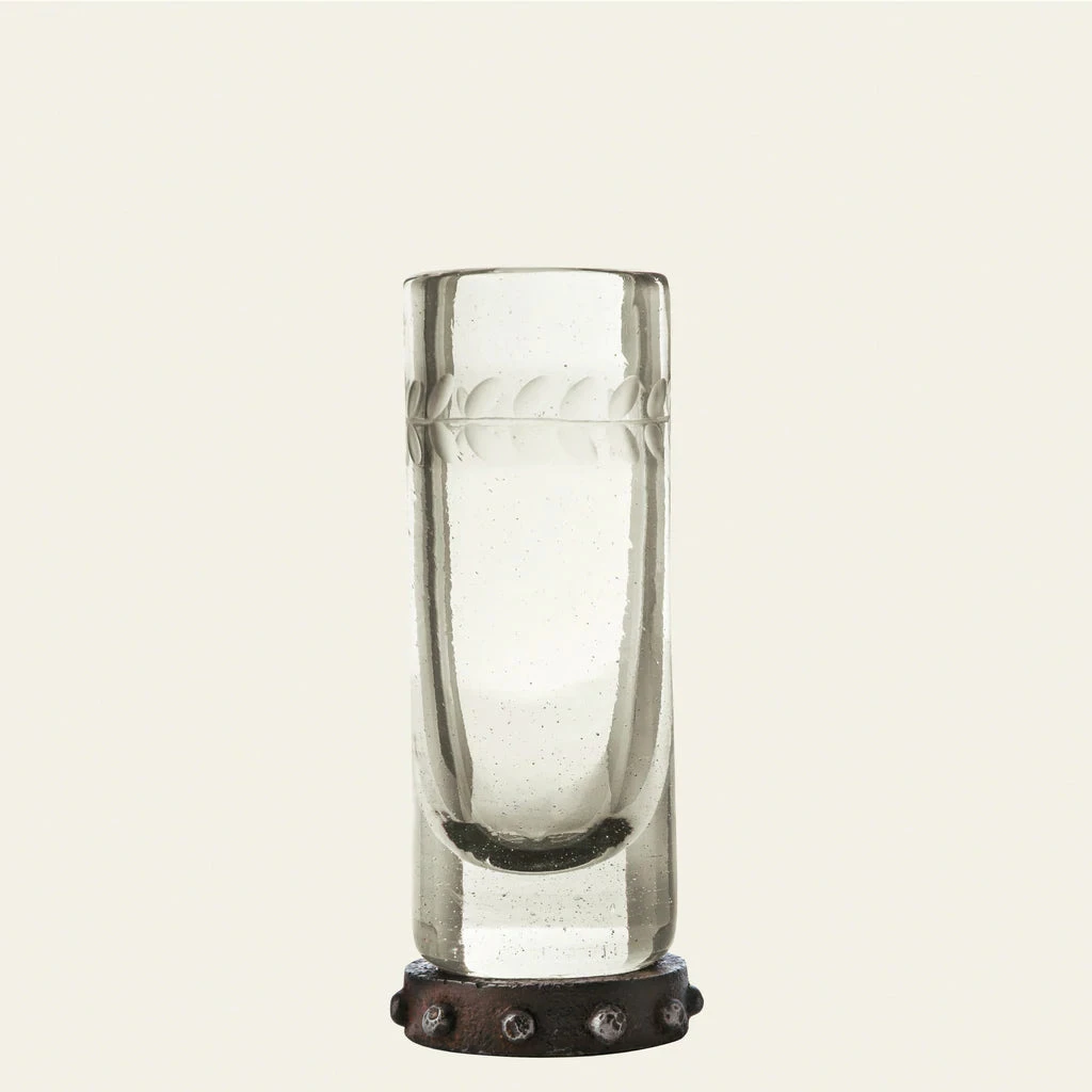 Set of 2 mouth blown and laurel engraved clear triple shot glass with beaded iron stand.