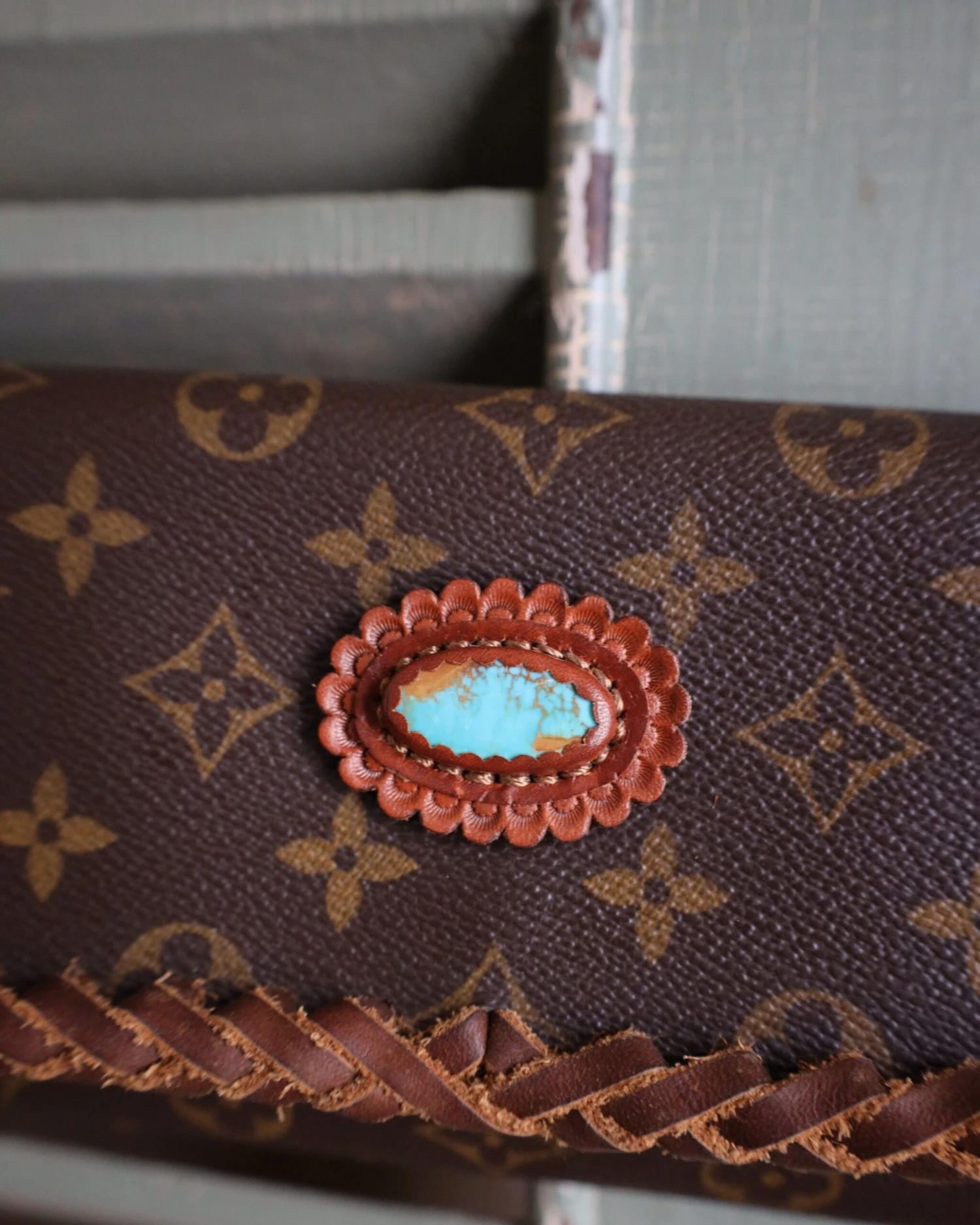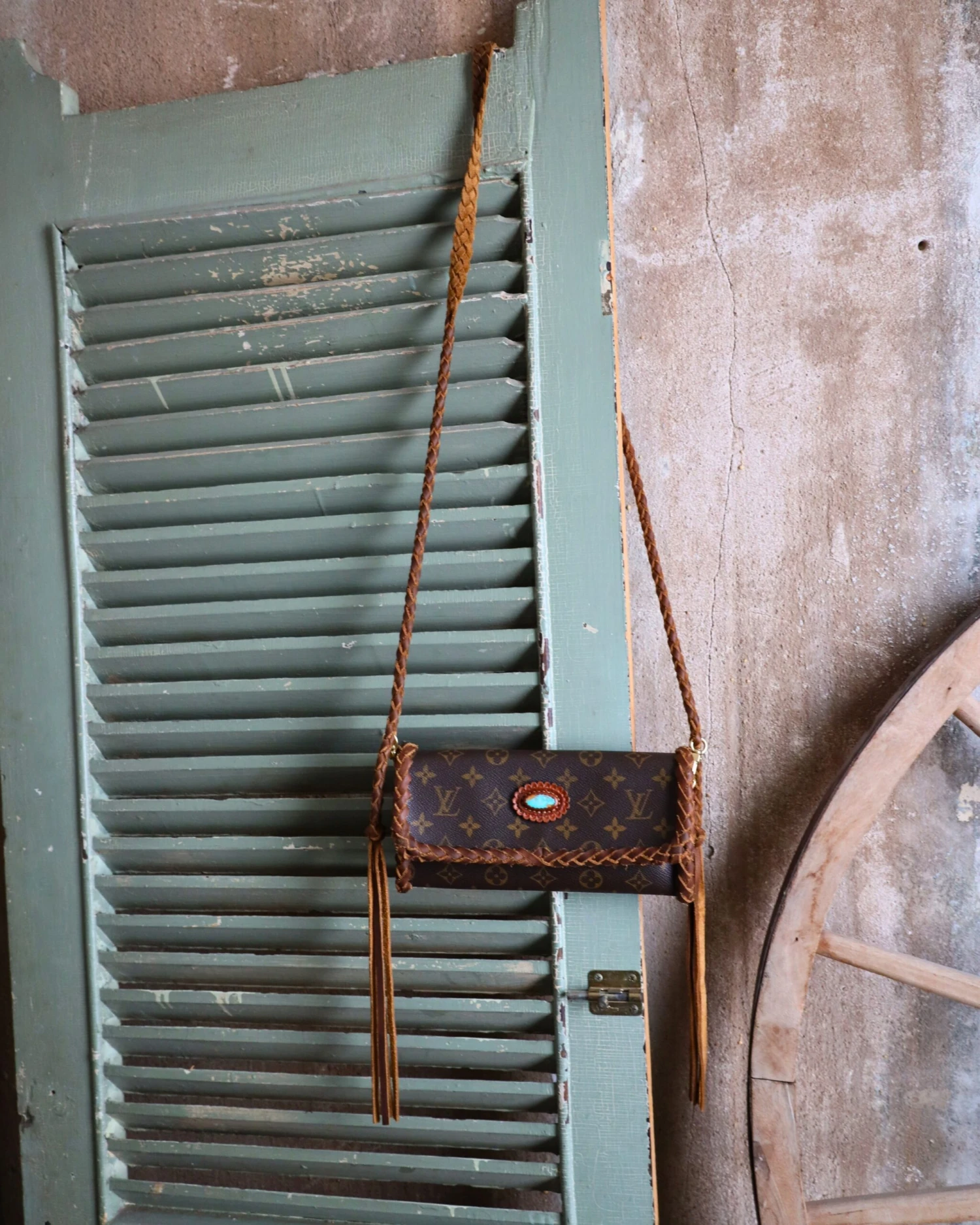This bag is enhanced in our signature Camel leather braidwork and embellished with a 20ct Kingman Turquoise stone.