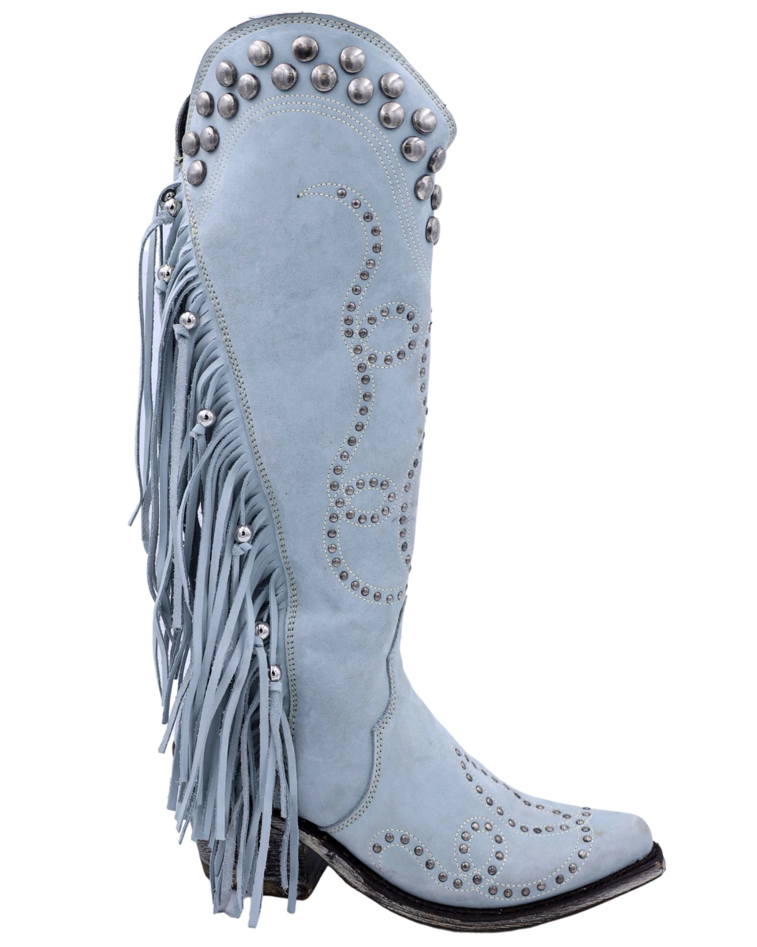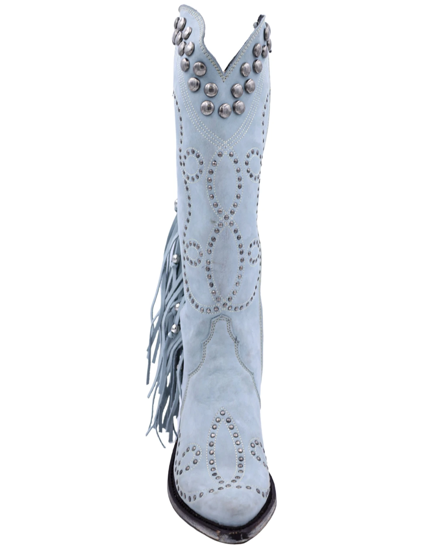 The neutral gray (small hints of light blue) leather on these Liberty Black Boots is luscious and lovely, all Fringe Benefits included! It’s all perfection – from the unique color – around to the studded stitch patterns throughout – and all the way down the cascading fringe – every inch of this sassy silhouette is bringing sexy back! Get flirty in these fun loving cowboy boots!
