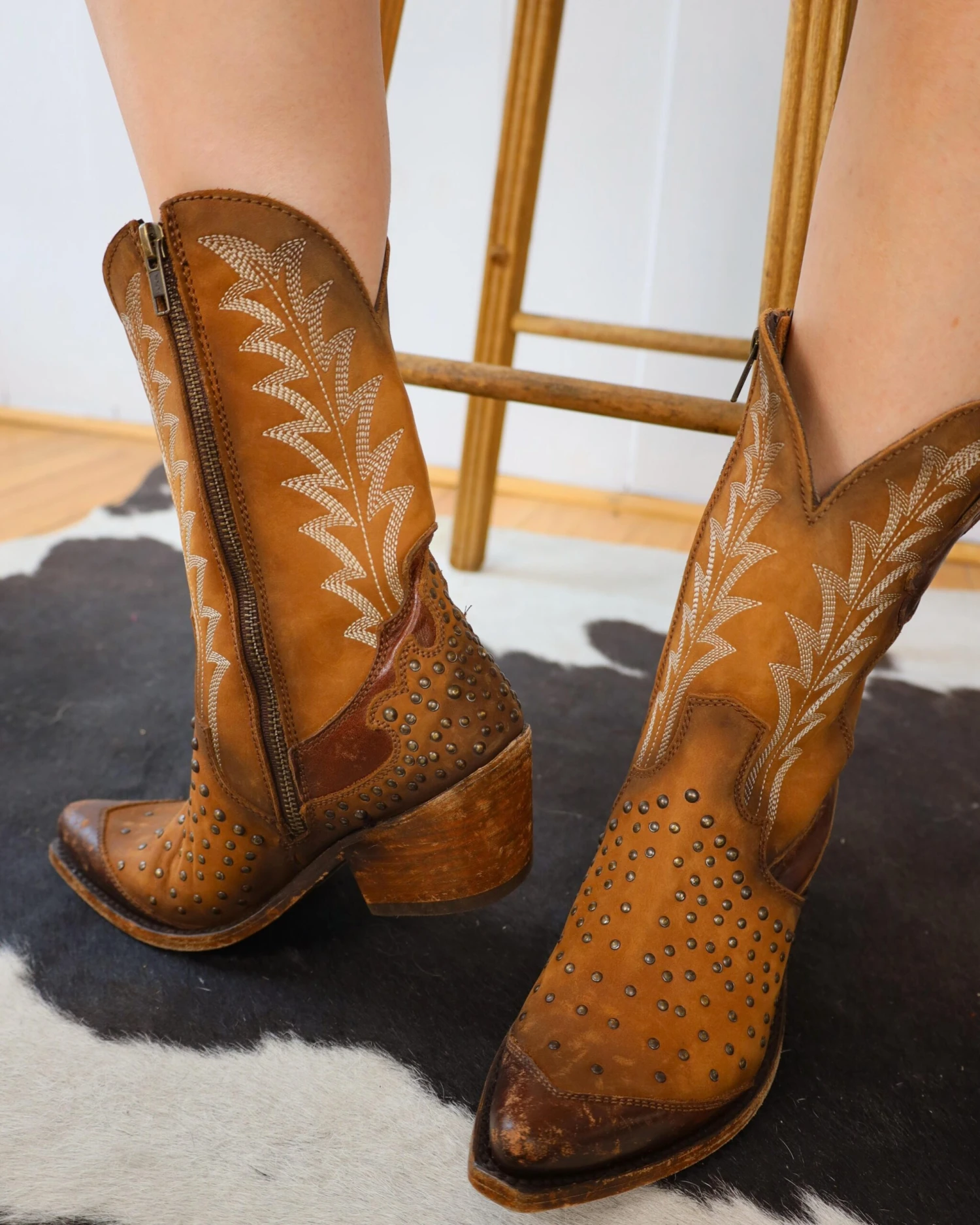 Swooning big time over these new neutral cowgirl boots by Liberty Black! This classic western design features a fun pop with brass studs – subtle stitch and distressed details – and the perfect mid calf silhouette. Traditional doesn’t have to be boring, little lady! These country kicks are great for wear year around!