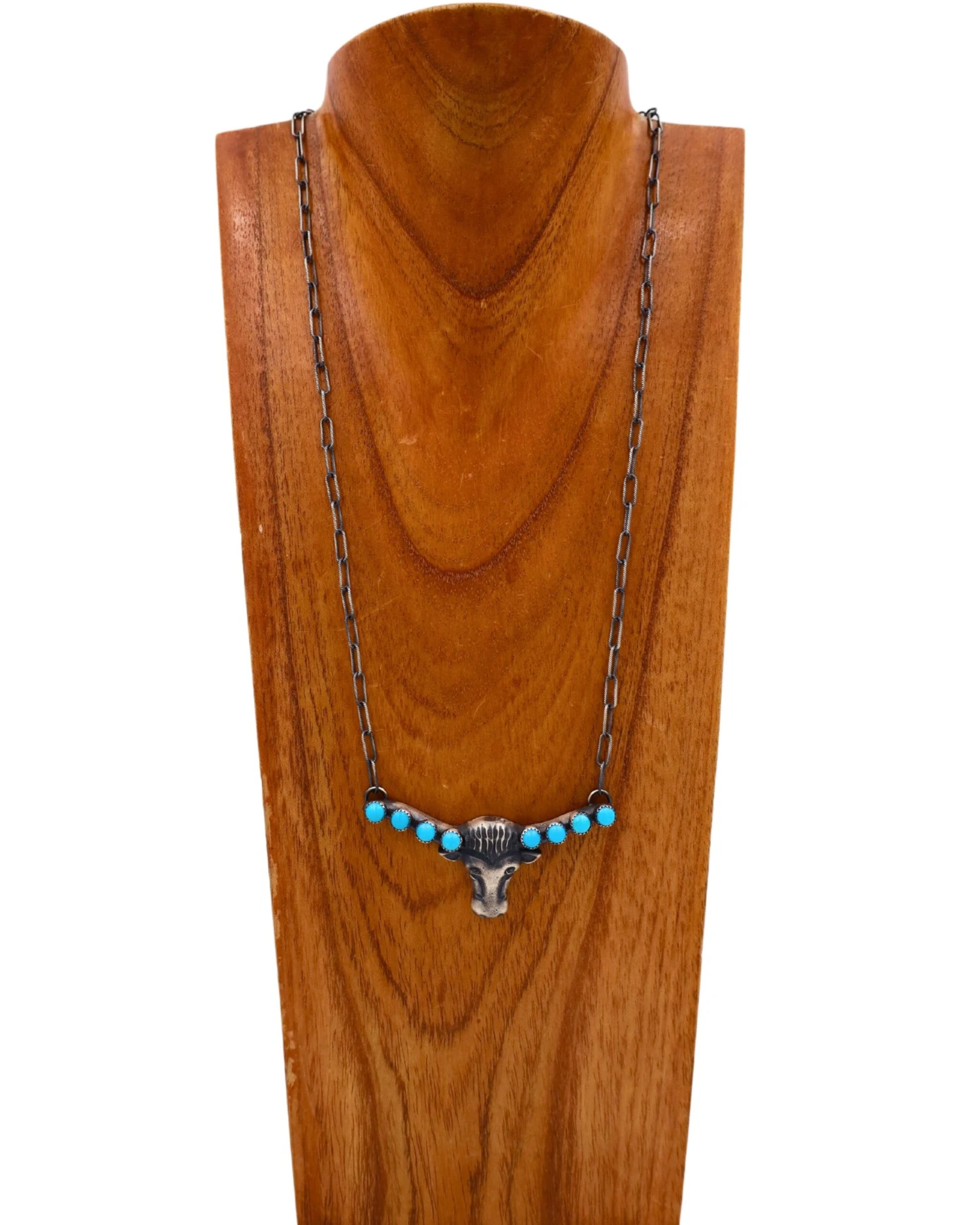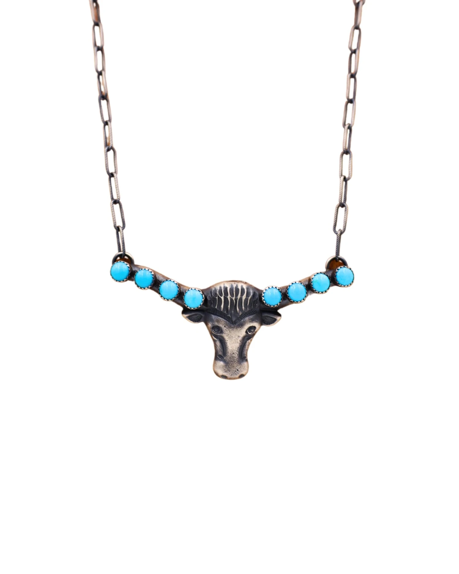 Introducing our stunning Western-style necklace, featuring a beautifully crafted sterling silver longhorn pendant adorned with four turquoise dots on each horn. This eye-catching pendant is the perfect centerpiece for any Western-inspired outfit.