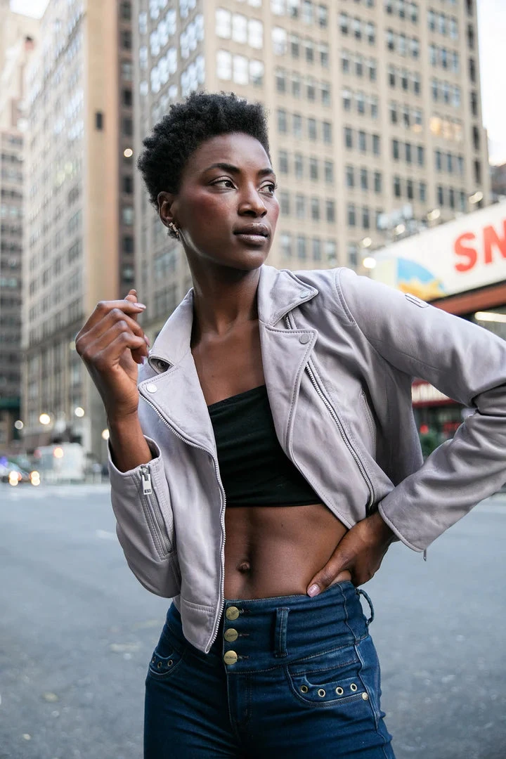 Short and sweet, a simple cropped moto jacket in beautiful light lavender.