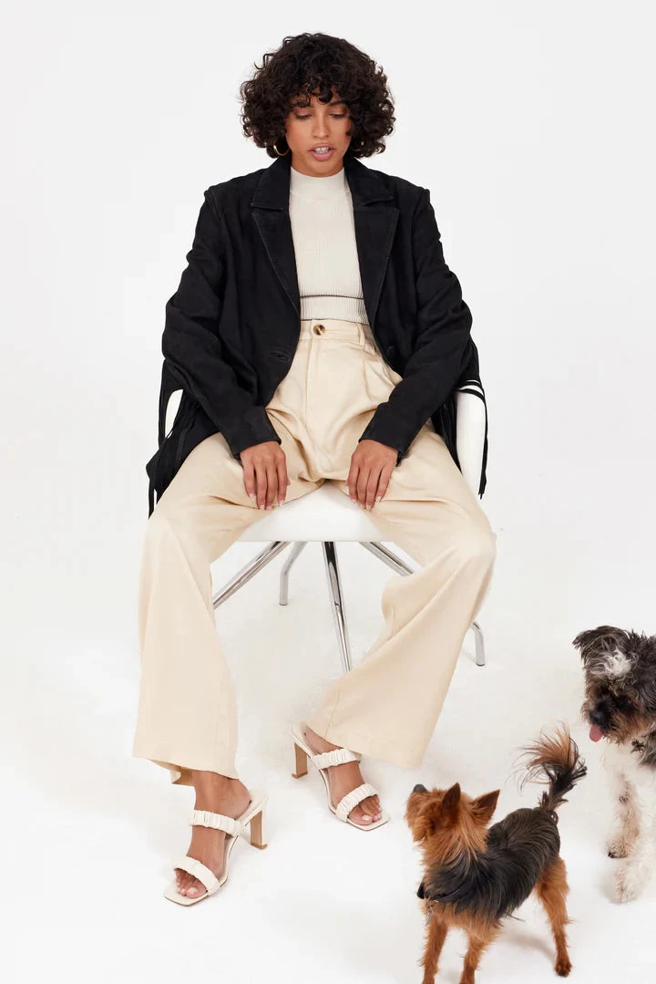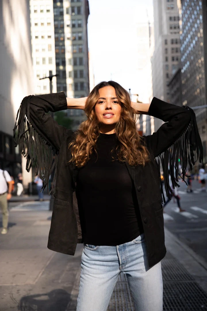 Our blazer styled leather jacket in soft nubuck leather, with fringe down the arms.