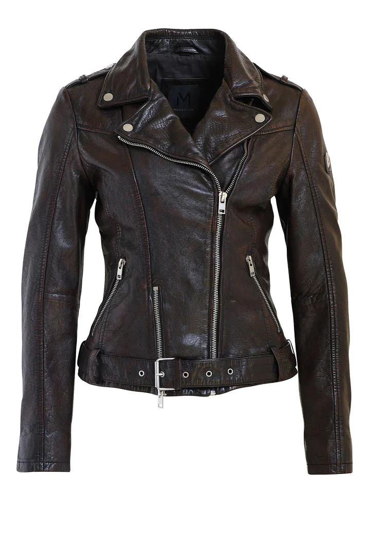 The perfect fit! WILD is a leather jacket with with a detailed collar and belt around the waist making a snug style.