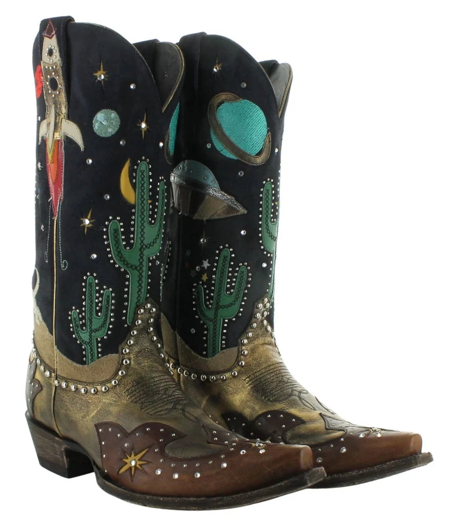 A long time ago… In a galaxy far, far away… lived the coolest, most out of this world pair of cowgirl boots known to woman! Meet the Galactic Buckaroo by Old Gringo Boots! The details are insane, y’all! The stars seriously aligned for this one – you’re looking at a black suede leather upper, copper vamp, and scenic views of a desert in the wild wild west – outer space style! Studs and crystals add sparkle to light up the night sky while colorful planets and spacecrafts create an adventurous mood. It’s time to giddy up little lady – to infinity and beyond!