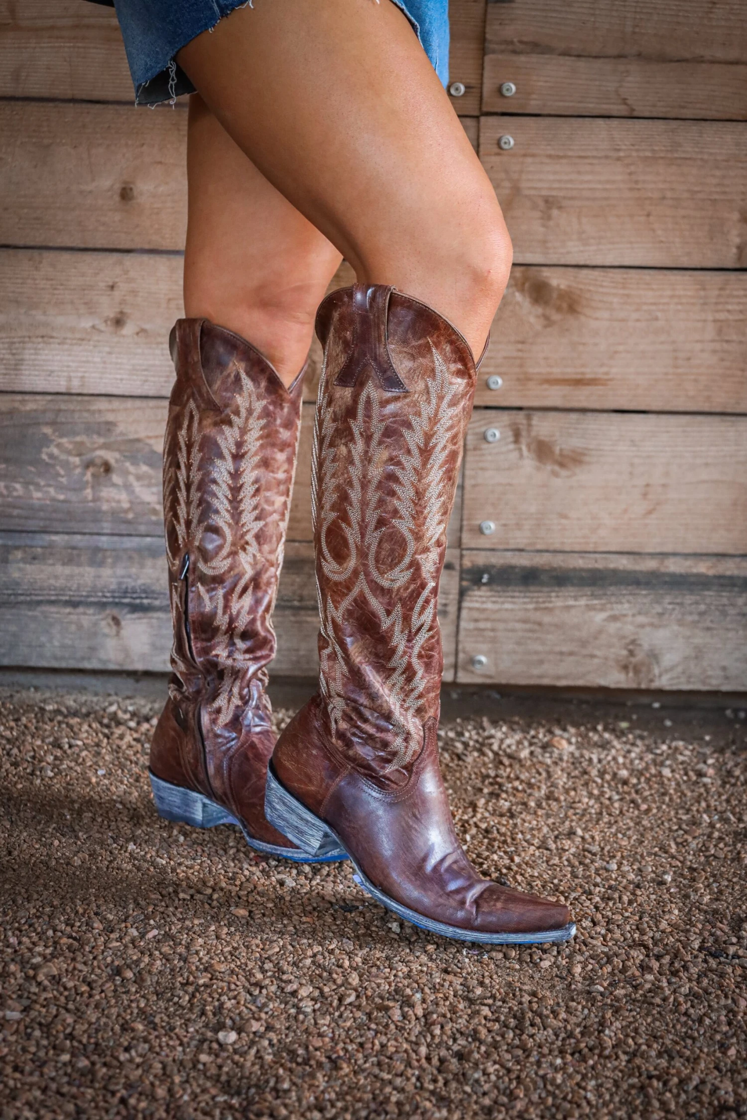 Timeless & Tall – The Mayra in Brass is a must-have pair. Western stitching on the shaft balanced with a pointed toe, for a more fashion-forward look.