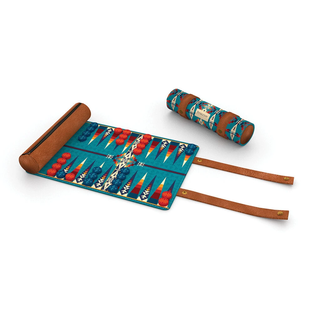 Roll out the fun at home, camp or on the road with this travel-friendly backgammon game. Canvas playing board features a colorful Pendleton pattern, and rolls up for easy toting. Includes 30 silkscreened wooden games pieces, 5 wooden dice and instructions—plus a vegan leather bag to store them all.