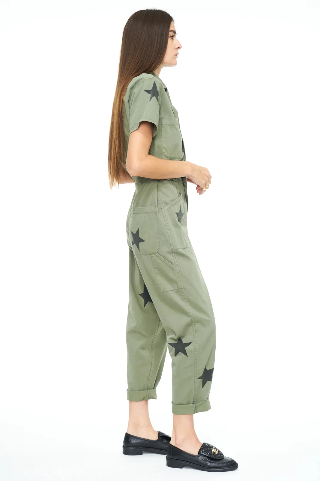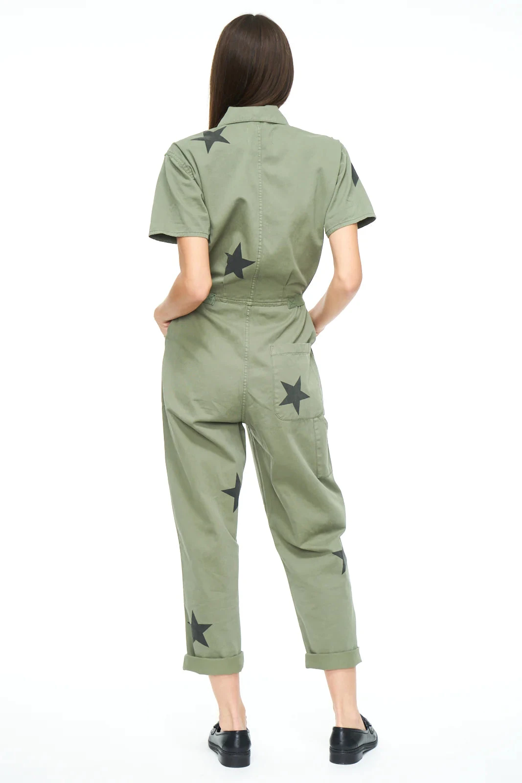 Our best selling jumpsuit is the star of the show with the printed black graphics. This relaxed fit one piece has a button front closure that lets you decide how high along the chest you’d like it, as well as adjustable button straps on the waist if you prefer a loose or defined fit.