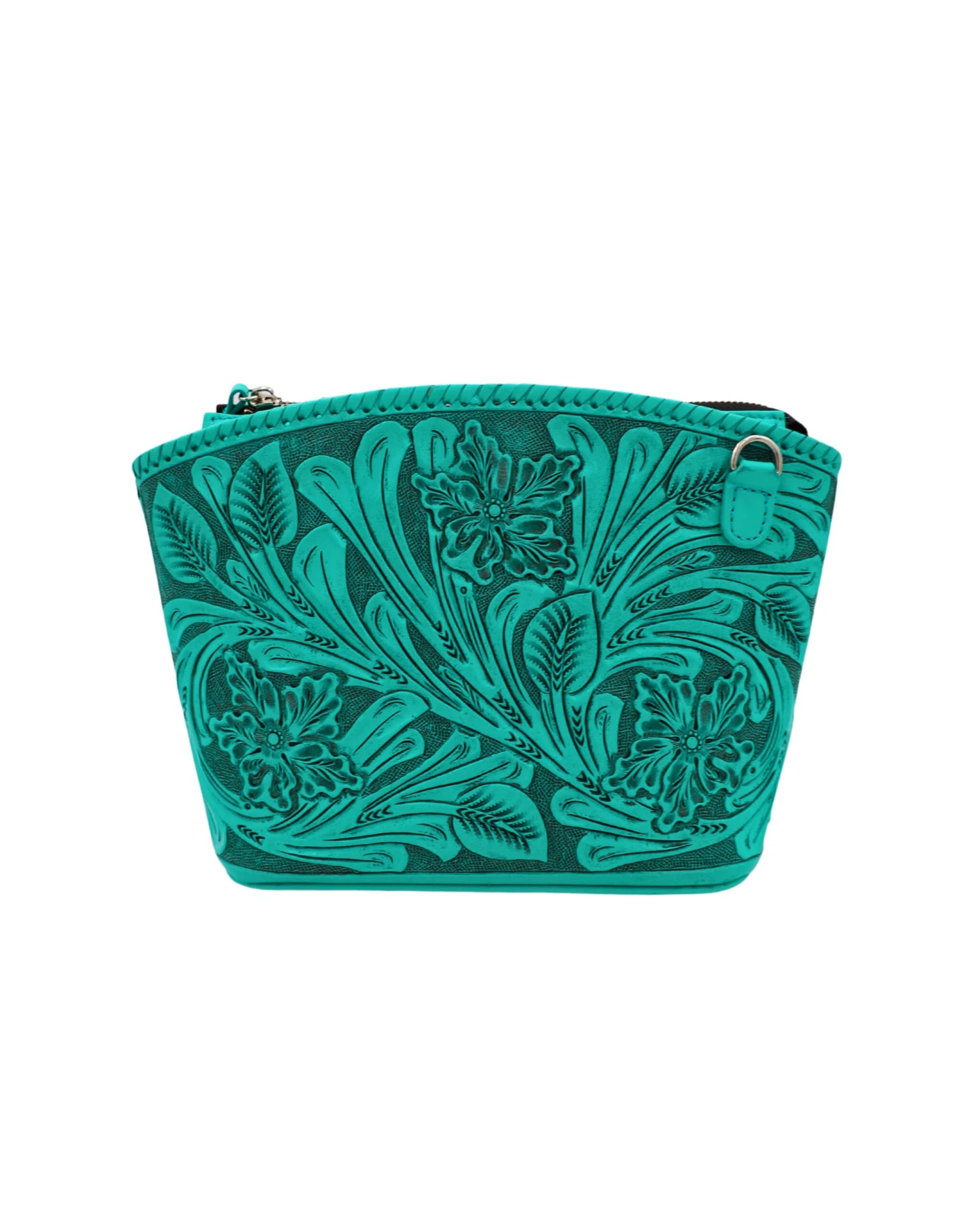 This hand tooled leather crossbody purse is amazing quality! Features a zipper closure, removable straps, interior zipper and pocket.