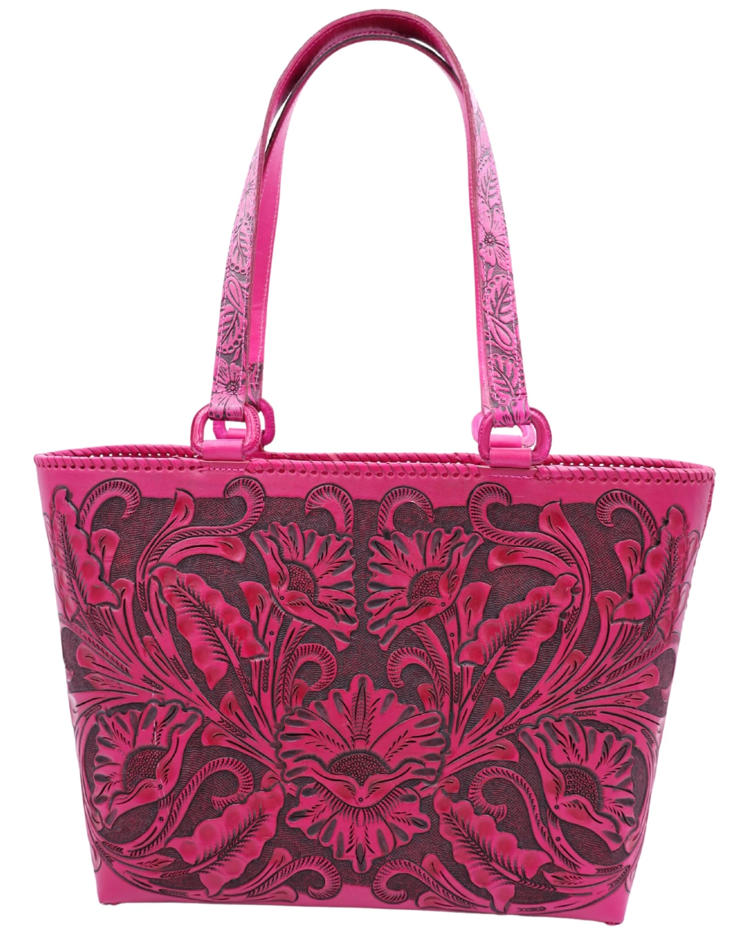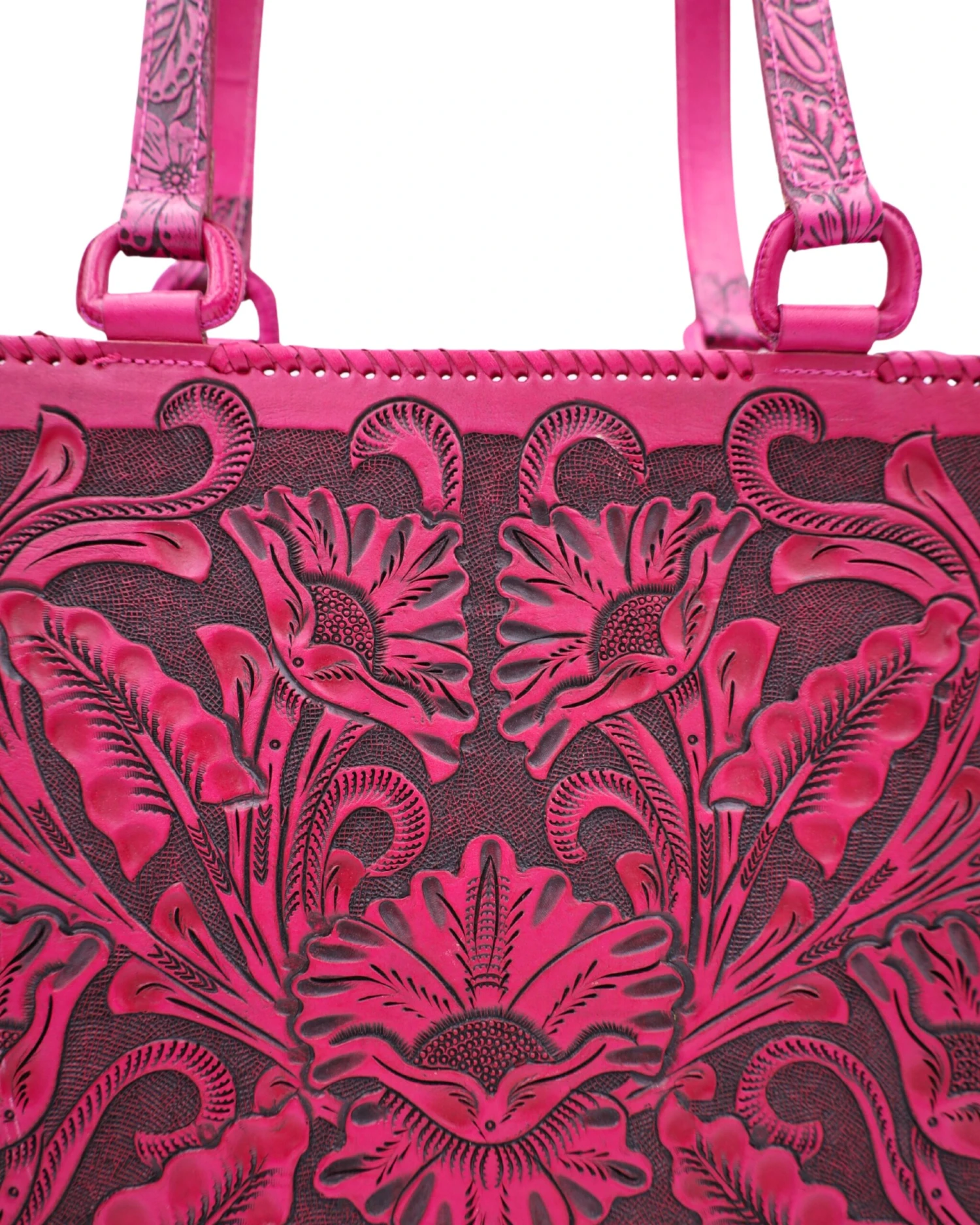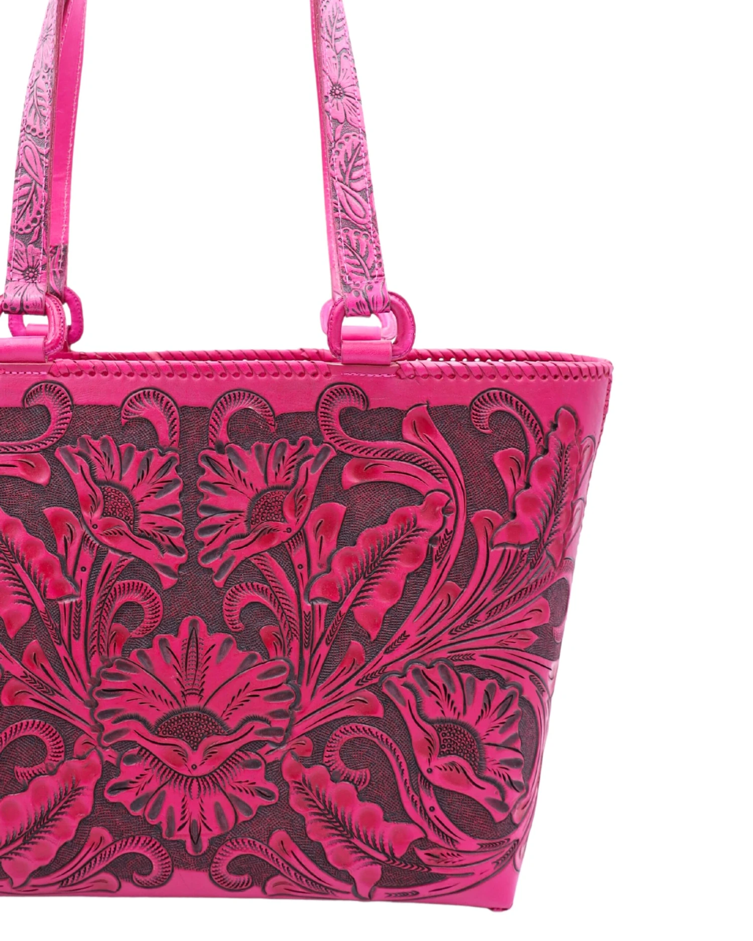 Sophisticated hand tooled leather purse from Mexico. Featuring a beautifully intricate floral design on the front and leather braiding design on the back. It also contains a zip closure and suede interior with an interior zipper pocket and 2 interior slip pockets.