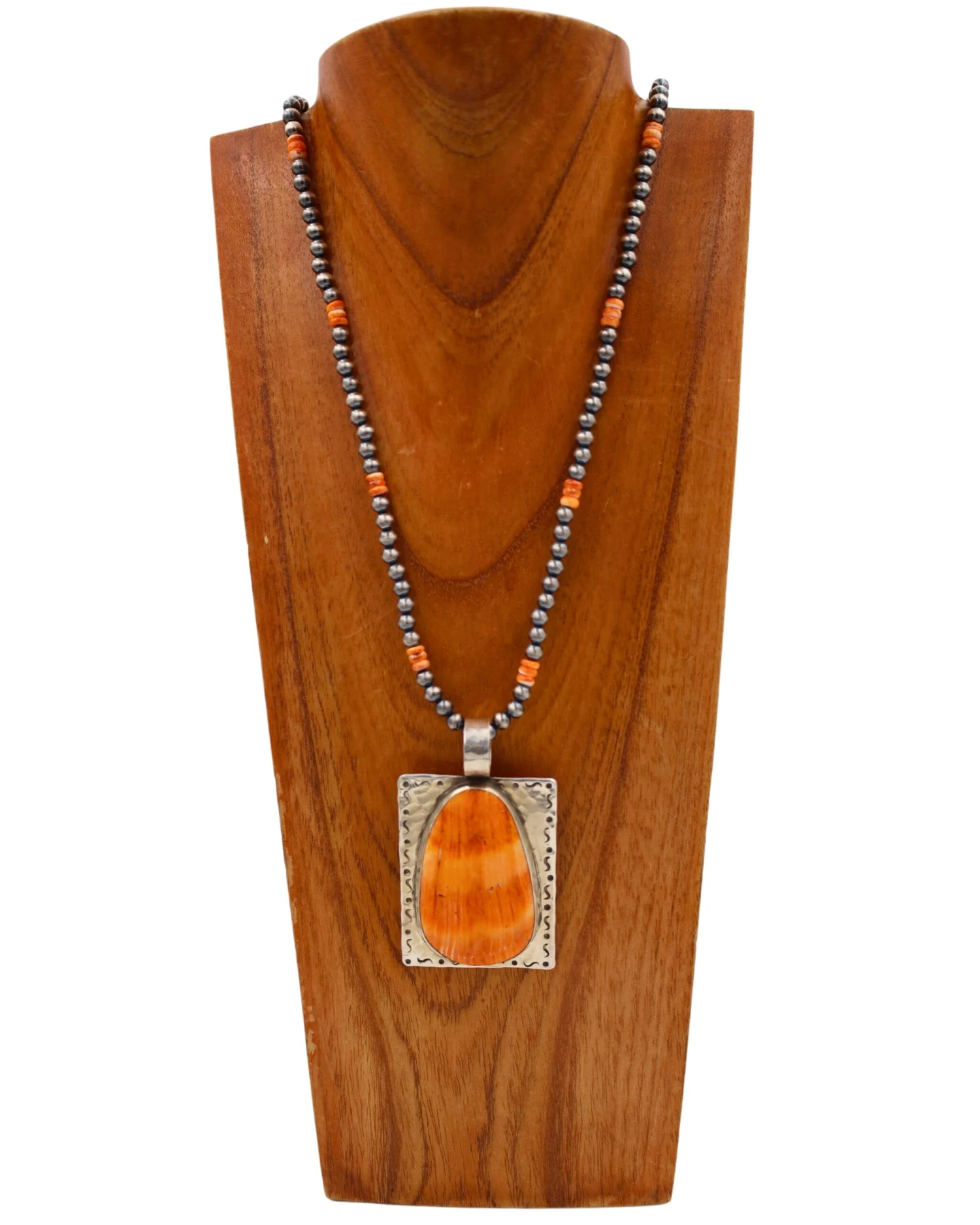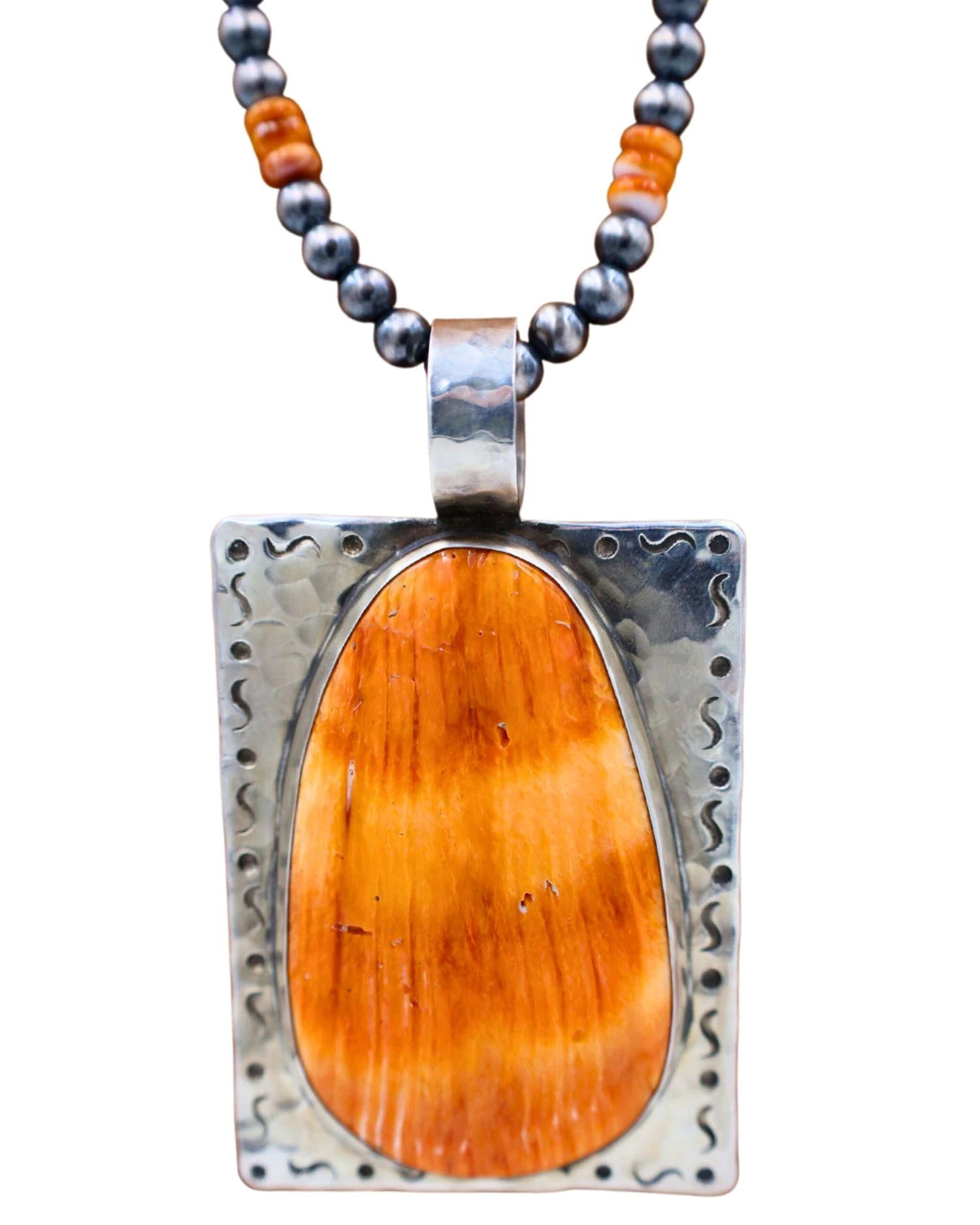 Handcrafted by Richard Schmidt, this extra large Spiny Oyster stone in sterling silver bezel pendant with stamping pattern on boarder will tie together any outfit.