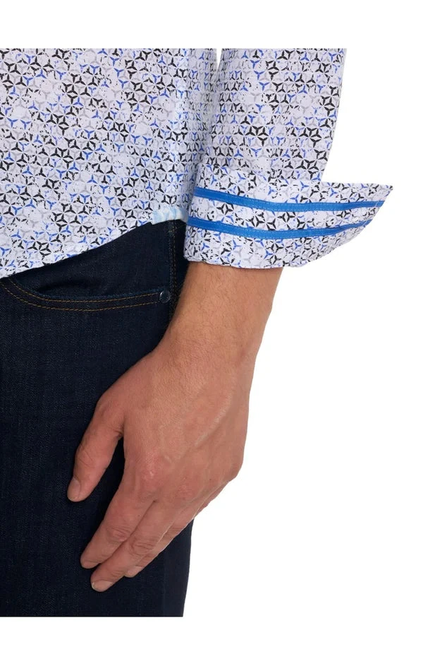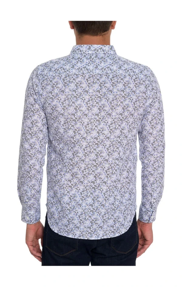 A tri-tone burn out geometric print gives dimension to this linen and cotton blend button down long sleeve shirt. Works really well with faded RG jeans.