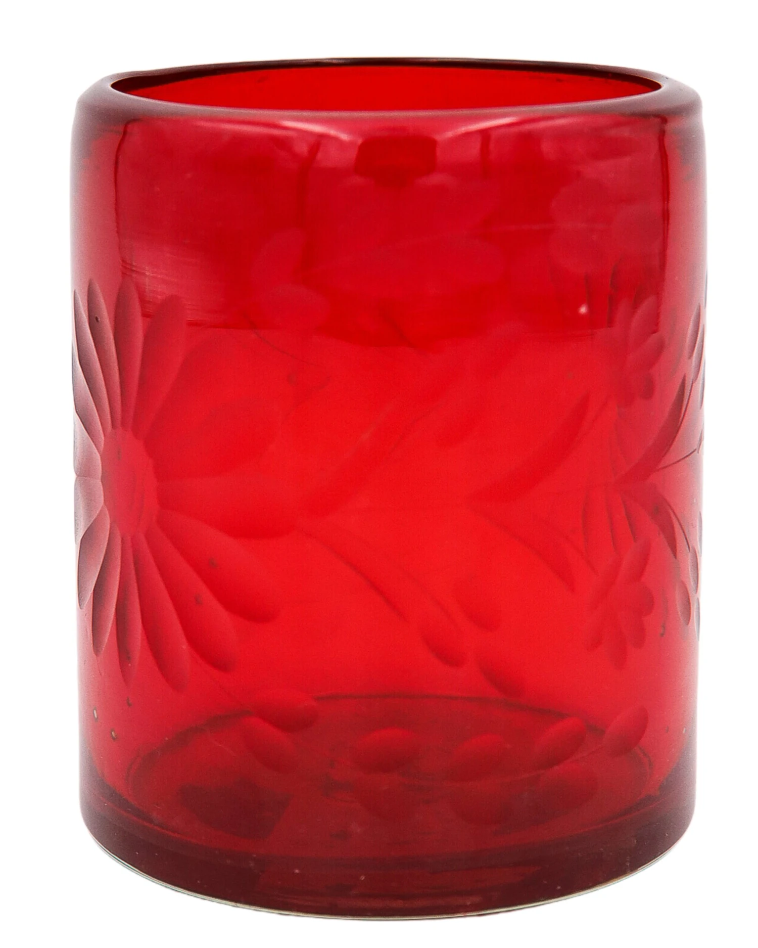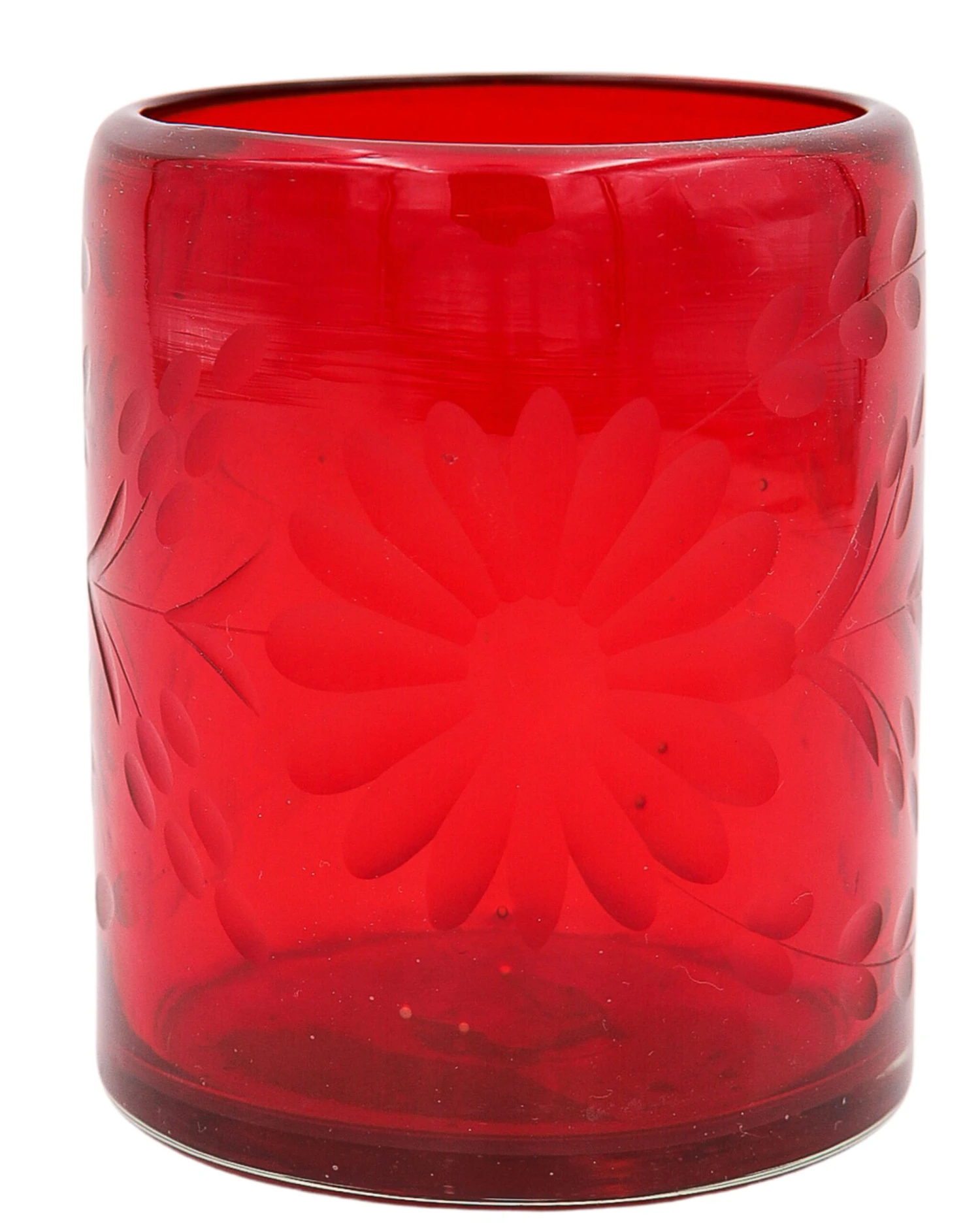 Rose Ann Hall Design’s Condessa Old Fashion Glass in Red is hand-blown by talented craftsmen in Mexico from recycled glass. Each glass is etched by skilled maestros who engrave the design directly onto the glass using only a grinding stone and an experienced eye.