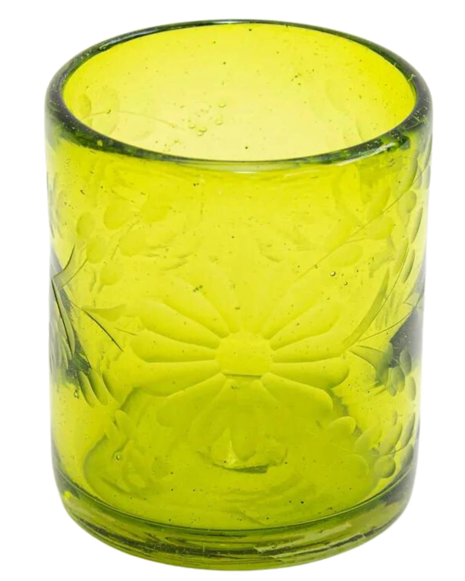 Rose Ann Hall Design’s Condessa Old Fashion Glass in Verde is hand-blown by talented craftsmen in Mexico from recycled glass. Each glass is etched by skilled maestros who engrave the design directly onto the glass using only a grinding stone and an experienced eye.